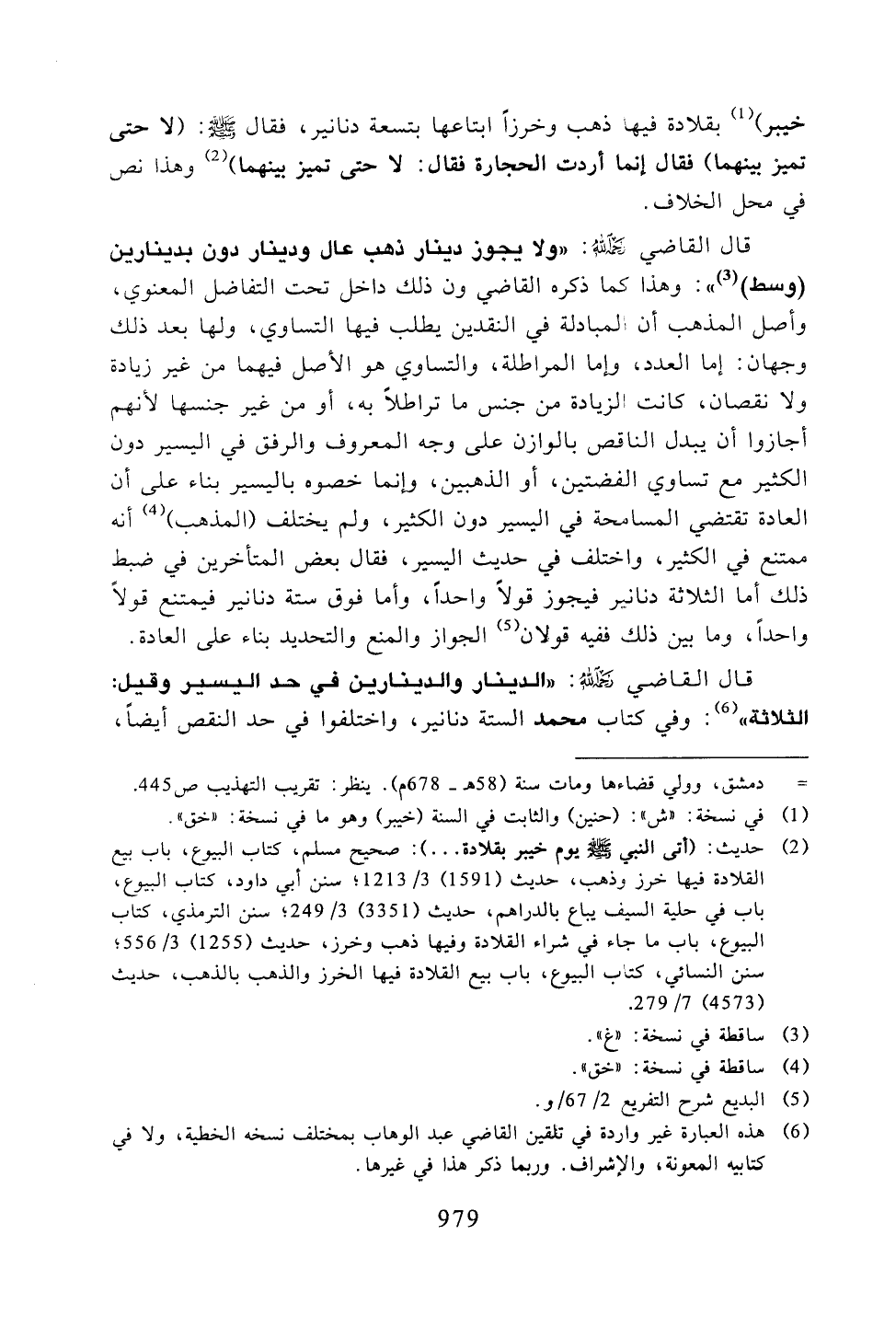 قال القاضي رحمه الله: «ولا يجوز دينار ذهب عال ودينار دون بدينارين (وسط)»: وهذا كما ذكره القاضي ون ذلك داخل تحت التفاضل المعنوي، وأصل المذهب أن المبادلة في النقدين يطلب فيها التساوي، ولها بعد ذلك وجهان: إما العدد، وإما المراطلة، والتسوي هو الأصل فيهما من غير زيادة ولا نقصان، كانت الزيادة من جنس ما تراطلًا به، أو من غير جنسها لأنهم أجازوا أن يبدل الناقص بالوازن على وجه المعروف والرفق في اليسير دون الكثير مع تساوي الفضتين، أو الذهبين، وإنما خصوه باليسير بناء على أن العادة تقتضي المسامحة في اليسير دون الكثير، ولم يختلف (المذهب) أنه ممتنع في الكثير، واختلف في حديث اليسير، فقال بعض المتأخرين في ضبط ذلك أما الثلاثة دنانير فيجوز قولاً واحدًا، وأما فوق ستة دنانير فيمتنع قولًا واحدًا، وما بين ذلك ففيه قولان الجواز والمنع والتحديد بناء على العادة.