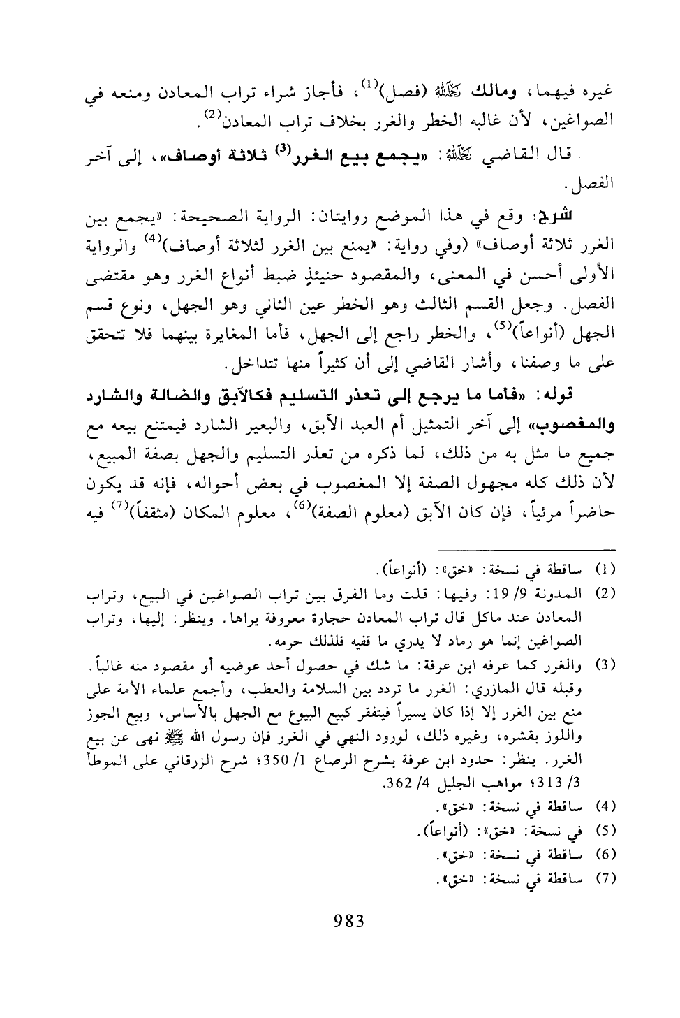 شرح: وقع في هذا الموضع روايتان: الرواية الصحيحة: "يجمع بين الغرر ثلاث أوصاف" (وفي رواية: "يمنع بين الغرر لثلاث أوصاف) والرواية الأولى أحسن في المعنى، والمقصود حنيئذ ضبط أنواع الغرر وهو مقتضي الفصل. وجعل القسم الثالث وهو الخطر عين الثاني وهو الجهل، ونوع قسم الجهاز (أنواعًا) والخطر راجع إلى الجهل، فأما المغايرة بينهما فلا تتحقق على ما وصفنا، وأشار القاضي إلى أن كثيرًا منها تتداخل.