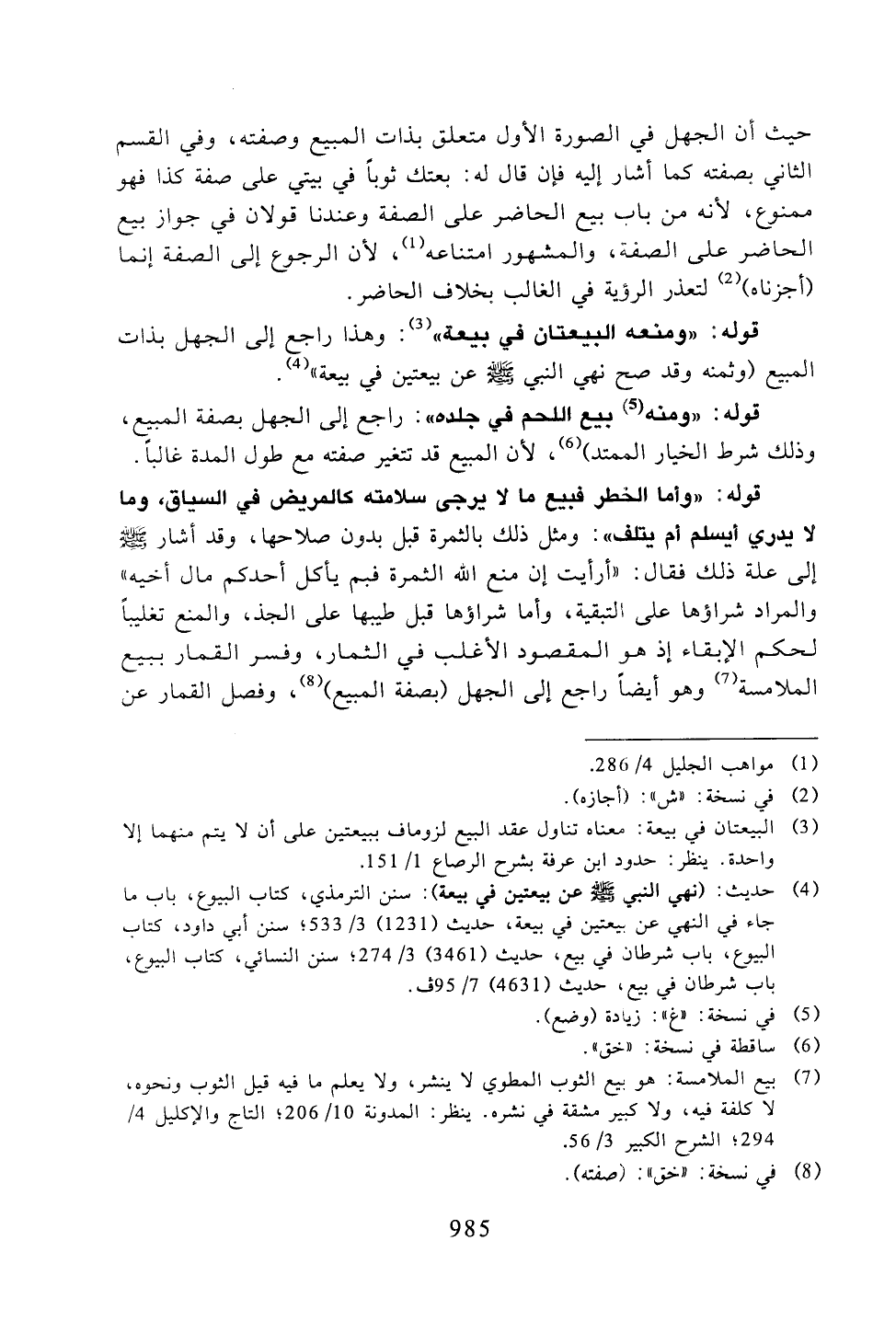 قوله: «ومنه بيع الحم في جلده»: راجع إلى الجهل بصفة المبيع، وذلك شرط الخيار المتد)، لن المبيع قد تغير صفته مع طول المدة غالباً.