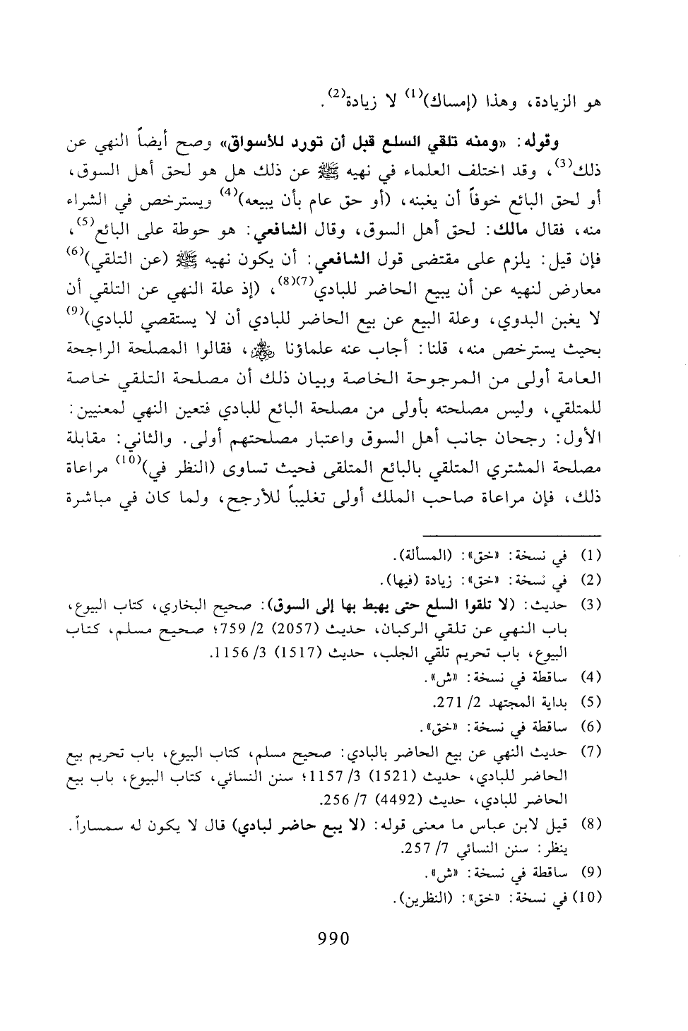 وقوله: «ومنه تلقى السلع قبل أن تورد للأسواق» وصح أيضاً النهي عن ذلك، وقد اختلف العلماء في نهيه صلى الله عليه وسلم عن ذلك هل هو لحق أهل السوق، أو لحق البائع خوفاً أن يغنيه، (أو حق عام بأن يبيعه) ويسترخص في الشراء منه، فقال مالك: لحق أهل السوق، وقال الشافعي: هوم حوطة على البائع، فإن قيل: يلزم على مقتضي قول الشافعي: أن يكون نهيه صلى الله عليه وسلم (عن التلقي) معارض لنهيه عن أن يبيع الحاضر للبادي، (إذ علة النهى عن التلقي أن لا يغبن البدوي، وعلى البيع عن بيع الحاضر للبادي أن لا يستقصى للبادي) بحيث يسترخص منه، قلنا: أجاب عنه علماؤنا رضي الله عنه، فقالوا المصلحة الراجحة العامة أولى من المرجوحجة الخاصة وبيان ذلك أن مصلحة التلقي خاصة للمتلقي، وليس مصلحته بأولى من مصلحة البائع للبادي فتعين النهى لمعنيين: الأول: رجحان جانب أهل السوق واعتبار مصلحتهم أولى. والثاني: مقابلة مصلحة المشتري المتلقي بالبائع المتلقي فحيث تساوي (النظر في) مراعاة ذلك، فإن مراعاة صاحل الملك أولى تغلبياً للأرجح، ولما كان في مباشرة