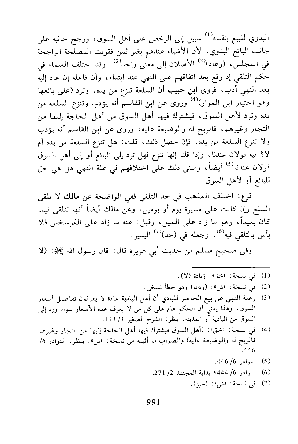 البدوي للبيع بنفسه سبيل إلى الرخص على أهل السوق، ورجح جانبه على جانب البائع البدوي، لأن الأشياء عندهم بغير ثمن فقويت المصلحة الراجحة في المجلس، (وعاد) الأصلان إلى معنى واحد. وقد اختلف العلماء في حكم التلقي إذ وقع بعد اتفاقهم على النهي عند ابتداء، وأن فاعله إن عاد إليه بعد النهي أدب، فروى ابن حبيب أن السلعة تنزع من يده، وترد (على بائعها وهو اختيار ابن المواز) وروى عن ابن القاسم أنه يؤدب وتنزع السلعة من يده وترد لأهل السوق، فيشترك فيها أهل السوق من أهل الحاجة إليها من التجار وغيرهم، فالربح له والوضيعة عليه، وروى عن ابن القاسم أنه يؤدب ولا تنزع السلعة من يده، فإذا حصل ذلك، قلت: هل تنزع السلعة من يده أم لا؟ فيه قولان عندنا، وإذا قلنا أنها تنزع فهل ترد إلى البائع أو إلى أهل السوق قولان عندنا أيضاً، ومبنى ذلك على اختلافهم في علة النهى هل هي حق للبائع أو لأهل السوق.
