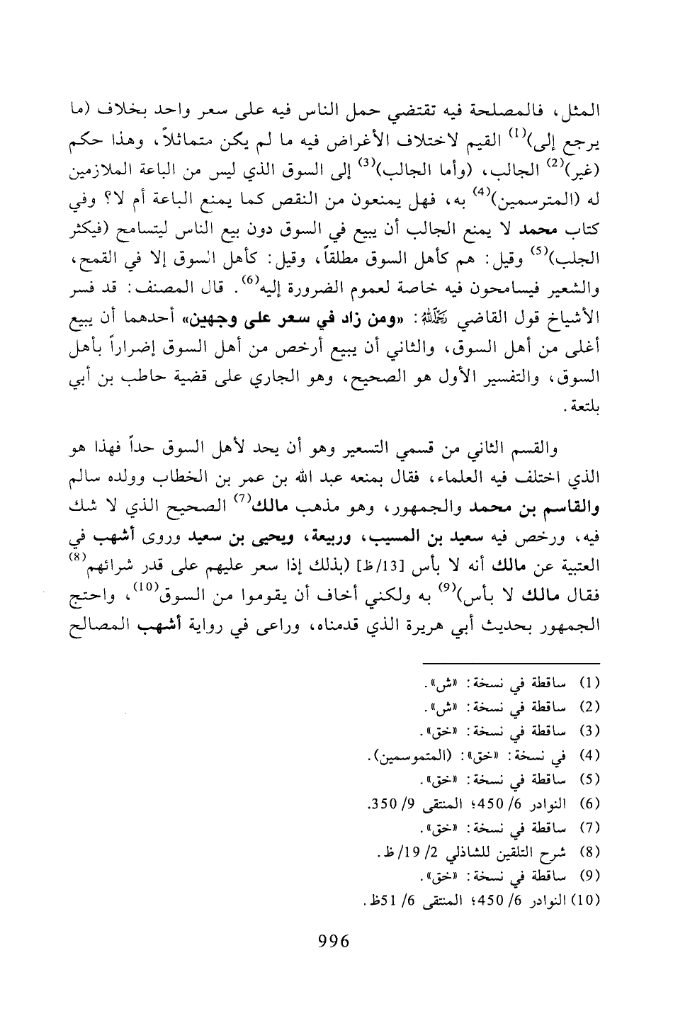 والقسم الثاني من قسمي التسعير وهو أن يحد لأهل السوق حداً فهذا هو الذي اختلف فيه العلماء، فقال بمنعه عبد الله بن عمر بن الخطاب، وولده سالم والقاسم بن محمد والجمهور، وهو مذهب مالك الصحيح الذي لا شك فيه، ورخص فيه سعيد بن المسيب، وربيعة، ويحي بن سعيد وروي أشهب في العتبية عن مالك أنه لا بأس إذا سعر عليهم على قدر شرائهم فقال مالك لا بأس) به ولكني أخاف أن يقوموا من السوق، واحتج الجمهور بحديث أبي هريرة الذي قدمناه، وراعى في رواية أشهب المصالح