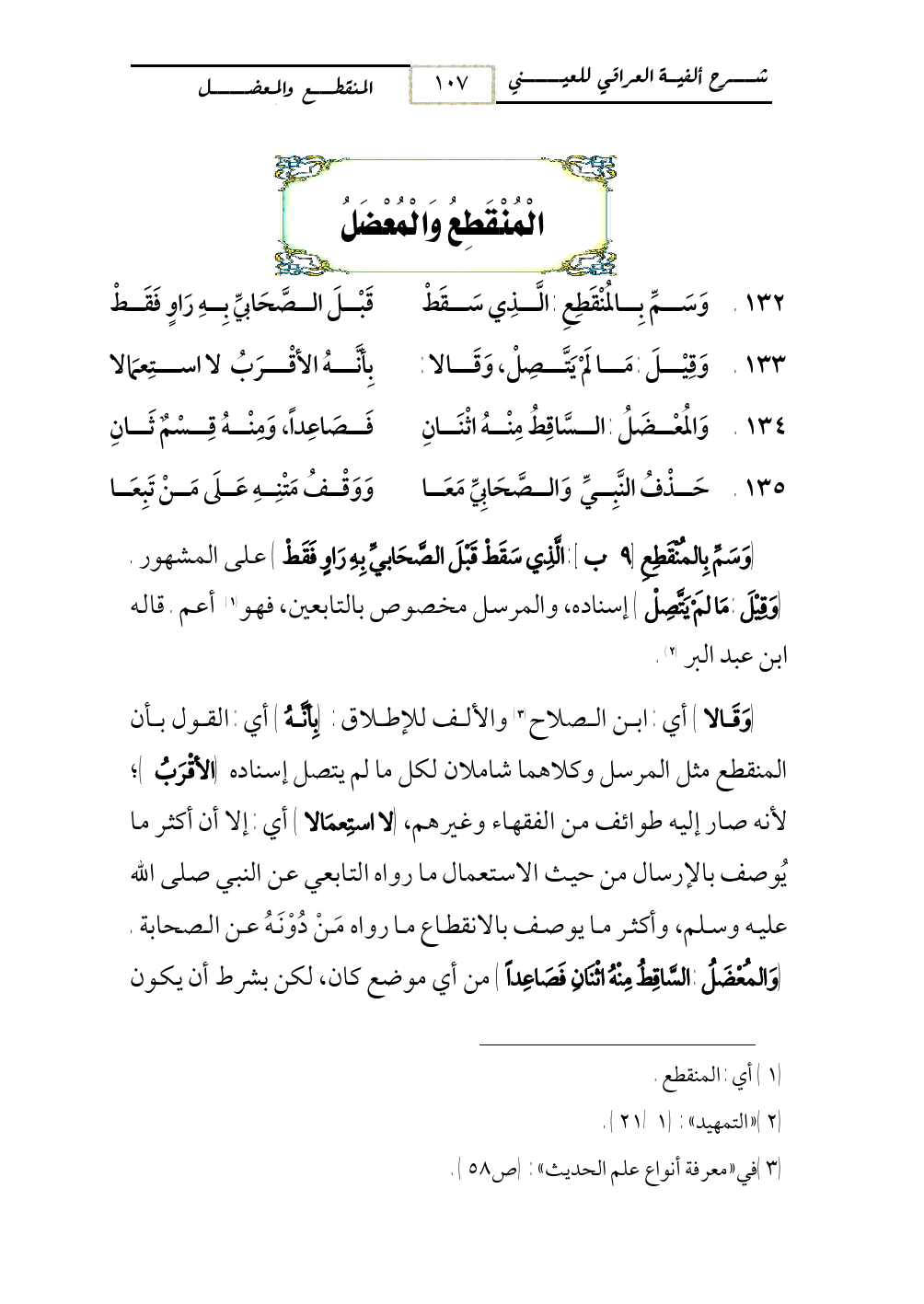 132 - وَسَمِّ بِالمُنْقَطِعِ: الَّذِي سَقَطْ ... قَبْلَ الصَّحَابيِّ بِهِ رَاوٍ فَقَطْ