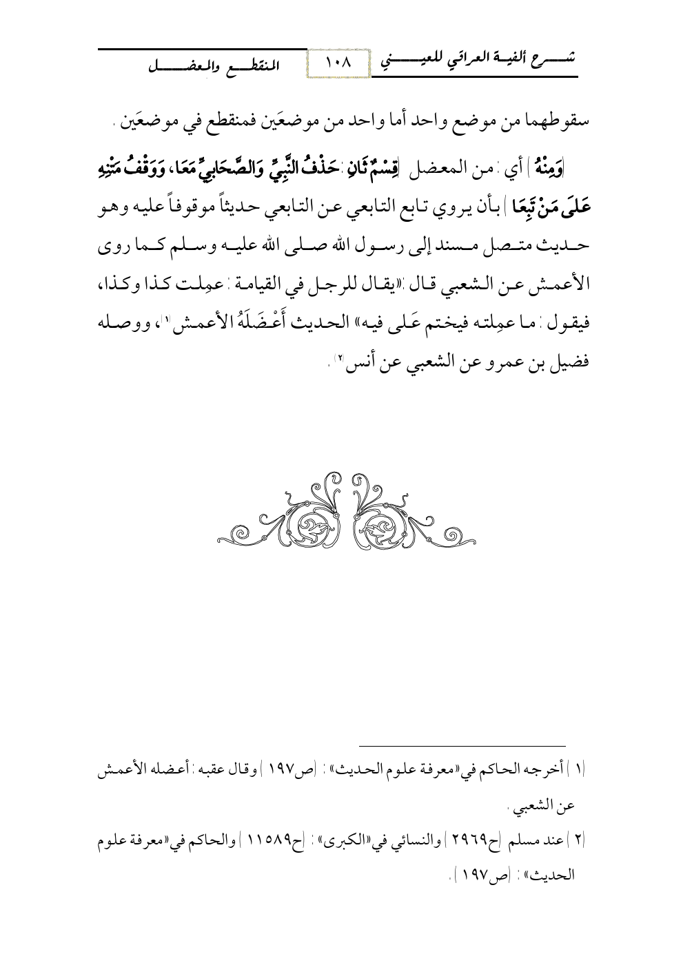 (وَمِنْهُ) أي: من المعضل (قِسْمٌ ثَانِ: حَذْفُ النَّبِيِّ وَالصَّحَابِيِّ مَعَا، وَوَقْفُ مَتْنِهِ عَلَى مَنْ تَبِعَا) بأن يروي تابع التابعي عن التابعي حديثاً موقوفاً عليه وهو حديث متصل مسند إلى رسول الله صلى الله عليه وسلم كما روى الأعمش عن الشعبي قال: «يقال للرجل في القيامة: عمِلت كذا وكذا، فيقول: ما عمِلته فيختم عَلى فيه» الحديث أَعْضَلَهُ الأعمش (¬1)، ووصله فضيل بن عمرو عن الشعبي عن أنس (¬2).