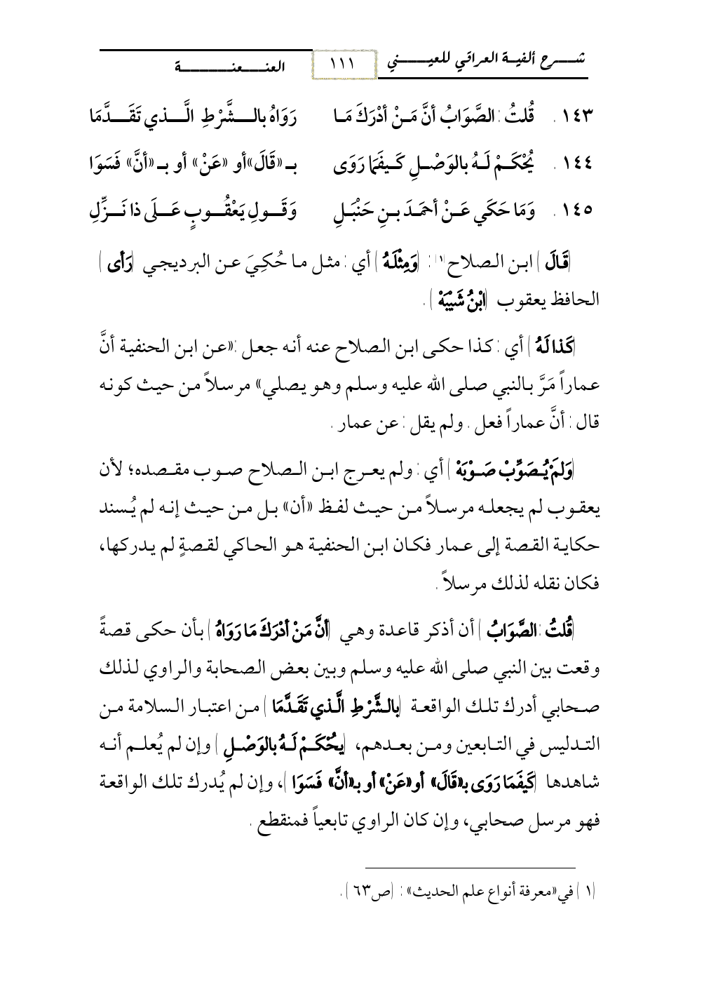 143 - قُلتُ: الصَّوَابُ أنَّ مَنْ أدْرَكَ مَا ... رَوَاهُ بالشَّرْطِ الَّذي تَقَدَّمَا
