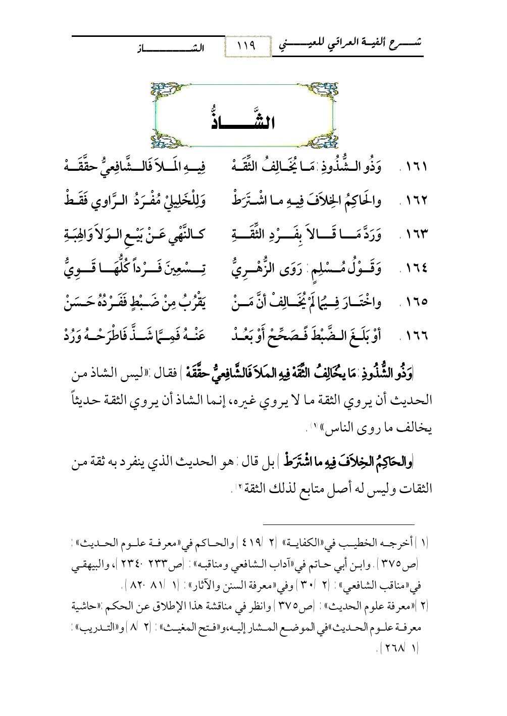 (وَذُو الشُّذُوذِ: مَا يُخَالِفُ الثِّقَهْ فِيهِ المَلاَ فَالشَّافِعيُّ حقَّقَهْ) فقال: «ليس الشاذ من الحديث أن يروي الثقة ما لا يروي غيره، إنما الشاذ أن يروي الثقة حديثاً يخالف ما روى الناس» (¬1).