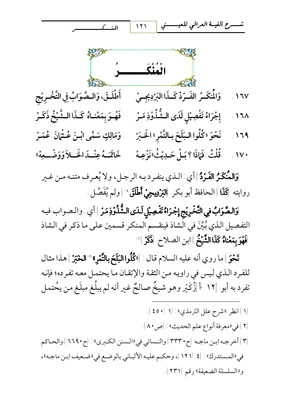 167 - وَالْمُنكَرُ: الفَرْدُ كَذَا البَرْدِيجِيْ ... أَطْلَقَ، وَالصَّوَابُ فِي التَّخْرِيْجِ