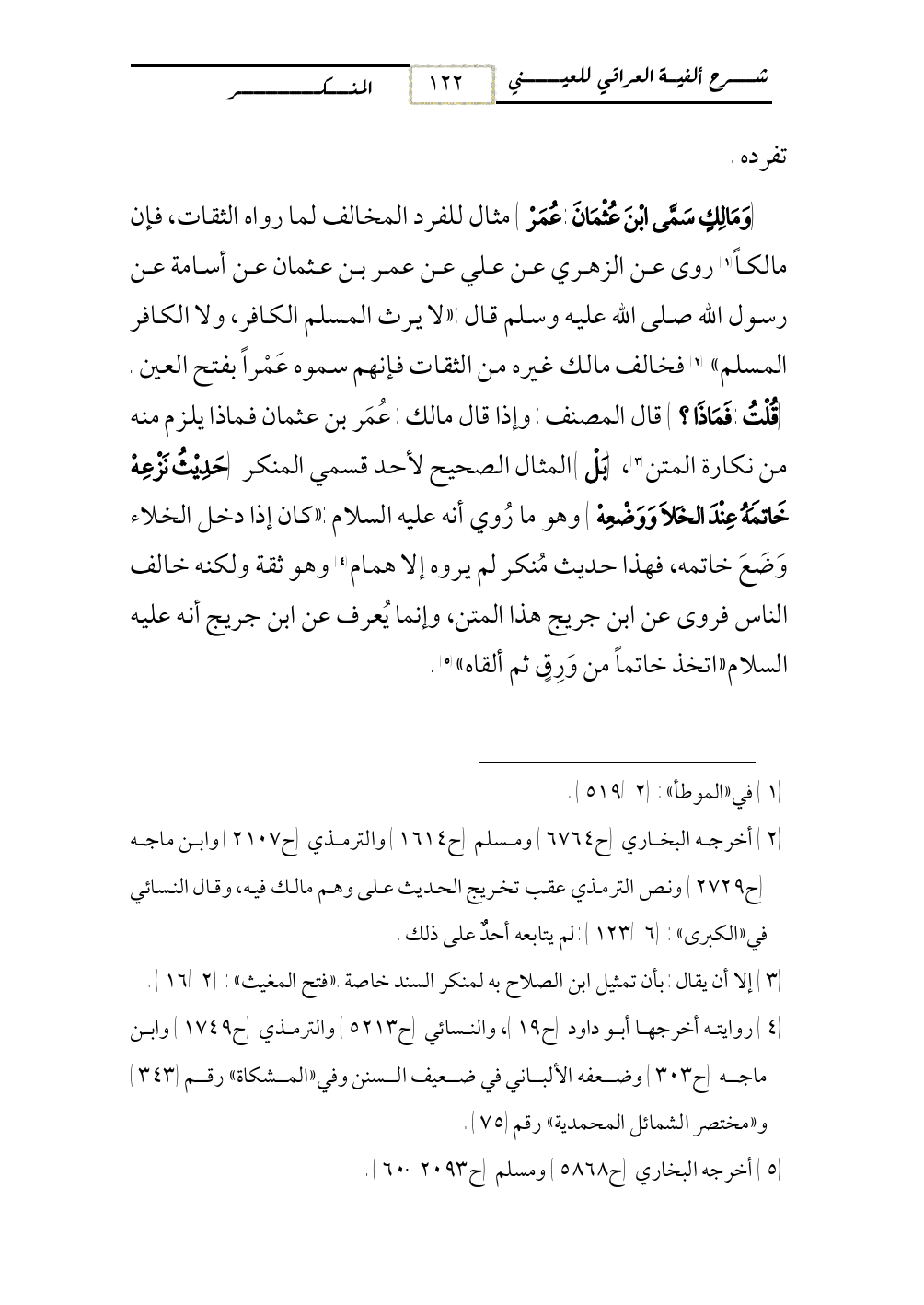 (وَمَالِكٍ سَمَّى ابْنَ عُثْمَانَ: عُمَرْ) مثال للفرد المخالف لما رواه الثقات، فإن مالكاً (¬1) روى عن الزهري عن علي عن عمر بن عثمان عن أسامة عن رسول الله صلى الله عليه وسلم قال: «لا يرث المسلم الكافر، ولا الكافر المسلم» (¬2) فخالف مالك غيره من الثقات فإنهم سموه عَمْراً بفتح العين. (قُلْتُ: فَمَاذَا؟) قال المصنف: وإذا قال مالك: عُمَر بن عثمان فماذا يلزم منه من نكارة المتن (¬3)، (بَلْ) المثال الصحيح لأحد قسمي المنكر (حَدِيْثُ نَزْعِهْ خَاتَمَهُ عِنْدَ الخَلاَ وَوَضْعِهْ) وهو ما رُوي أنه عليه السلام: «كان إذا دخل الخلاء وَضَعَ خاتمه، فهذا حديث مُنكر لم يروه إلا همام (¬4) وهو ثقة ولكنه خالف الناس فروى عن ابن جريج هذا المتن، وإنما يُعرف عن ابن جريج أنه عليه السلام «اتخذ خاتماً من وَرِقٍ ثم ألقاه» (¬5).