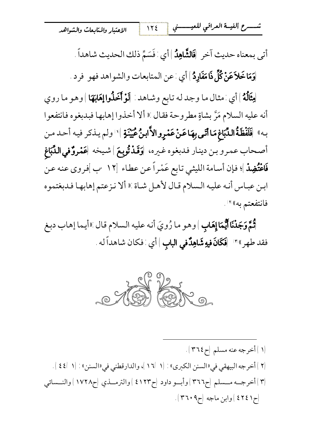 (مِثَالُهُ) أي: مثال ما وجد له تابع وشاهد: (لَوْ أَخَذُوا إهَابَهَا) وهو ما روي أنه عليه السلام مَرَّ بشاةٍ مطروحة فقال: «ألا أخذوا إهابها فبدبغوه فانتفعوا به» (فَلَفْظَةُ الدِّبَاغِ مَا أتَى بِهَا عَنْ عَمْرٍو الاَّ ابنُ عُيَيْنَةٍ) (¬1) ولم يذكر فيه أحد من أصحاب عمرو بن دينار فدبغوه غيره، (وَقَدْ تُوبِعَ) شيخه (عَمْروٌ في الدِّبَاغِ فَاعْتُضِدْ)؛ فإن أسامة الليثي تابع عَمْراً عن عطاء [12 - ب] فروى عنه عن ابن عباس أنه عليه السلام قال لأهل شاة: «ألا نزعتم إهابها فدبغتموه فانتفعتم به» (¬2).
