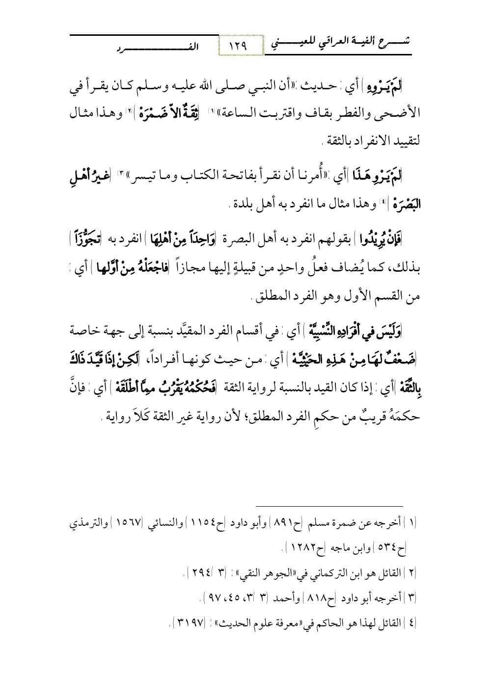 (لَمْ يَرْوِهِ) أي: حديث: «أن النبي صلى الله عليه وسلم كان يقرأ في الأضحى والفطر بقاف واقتربت الساعة» (¬1) (ثِقَةٌ الاّ ضَمْرَهْ) (¬2) وهذا مثال لتقييد الانفراد بالثقة.