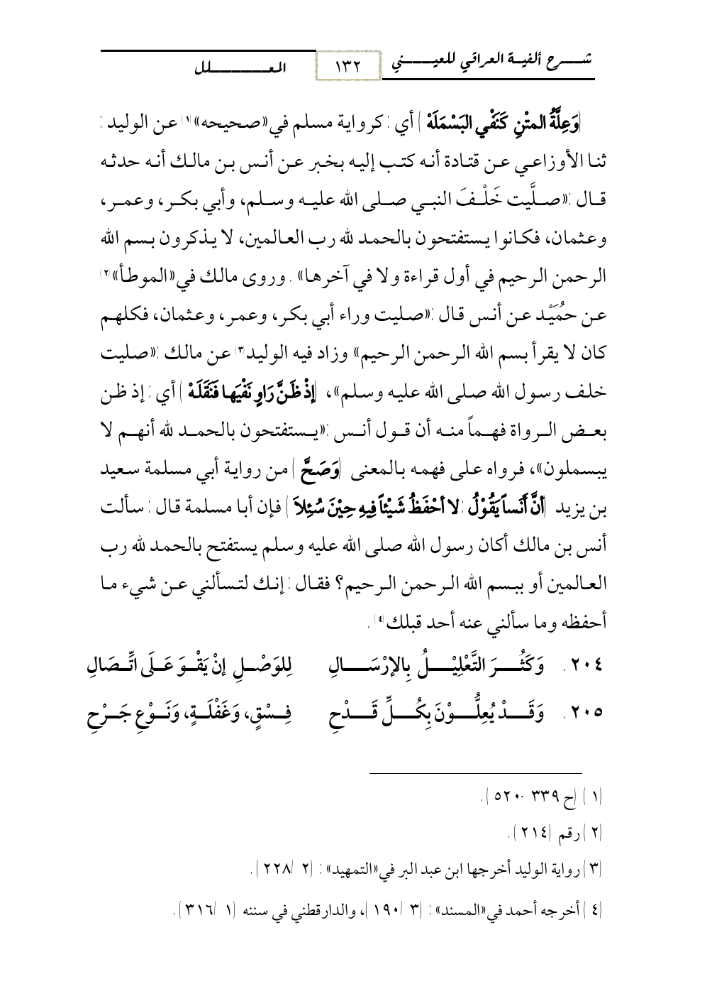 (وَعِلَّةُ المتْنِ كَنَفْي البَسْمَلَهْ) أي: كرواية مسلم في «صحيحه» (¬1) عن الوليد: ثنا الأوزاعي عن قتادة أنه كتب إليه بخبر عن أنس بن مالك أنه حدثه قال: «صلَّيت خَلْفَ النبي صلى الله عليه وسلم، وأبي بكر، وعمر، وعثمان، فكانوا يستفتحون بالحمد لله رب العالمين، لا يذكرون بسم الله الرحمن الرحيم في أول قراءة ولا في آخرها». وروى مالك في «الموطأ» (¬2) عن حُمَيْد عن أنس قال: «صليت وراء أبي بكر، وعمر، وعثمان، فكلهم كان لا يقرأ بسم الله الرحمن الرحيم» وزاد فيه الوليد (¬3) عن مالك: «صليت خلف رسول الله صلى الله عليه وسلم»، (إذْ ظَنَّ رَاوٍ نَفْيَها فَنَقَلَهْ) أي: إذ ظن بعض الرواة فهماً منه أن قول أنس: «يستفتحون بالحمد لله أنهم لا يبسملون»، فرواه على فهمه بالمعنى (وَصَحَّ) من رواية أبي مسلمة سعيد بن يزيد (أنَّ أَنَساً يَقُوْلُ: لا أحْفَظُ شَيْئاً فِيهِ حِيْنَ سُئِلاَ) فإن أبا مسلمة قال: سألت أنس بن مالك أكان رسول الله صلى الله عليه وسلم يستفتح بالحمد لله رب العالمين أو ببسم الله الرحمن الرحيم؟ فقال: إنك لتسألني عن شيء ما أحفظه وما سألني عنه أحد قبلك (¬4).