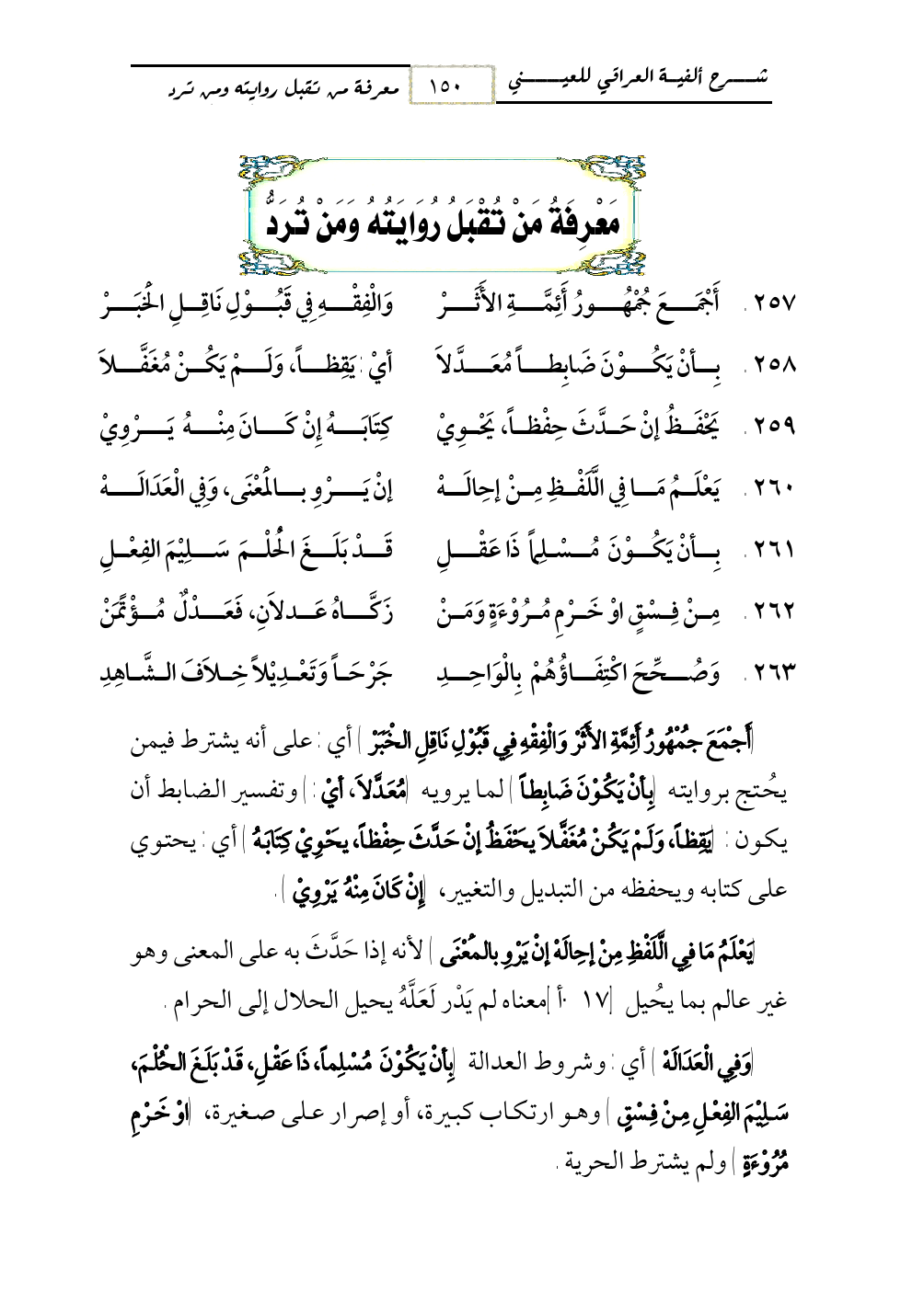 258 - بِأنْ يَكُوْنَ ضَابِطاً مُعَدَّلاَ ... أيْ: يَقِظاً، وَلَمْ يَكُنْ مُغَفَّلاَ