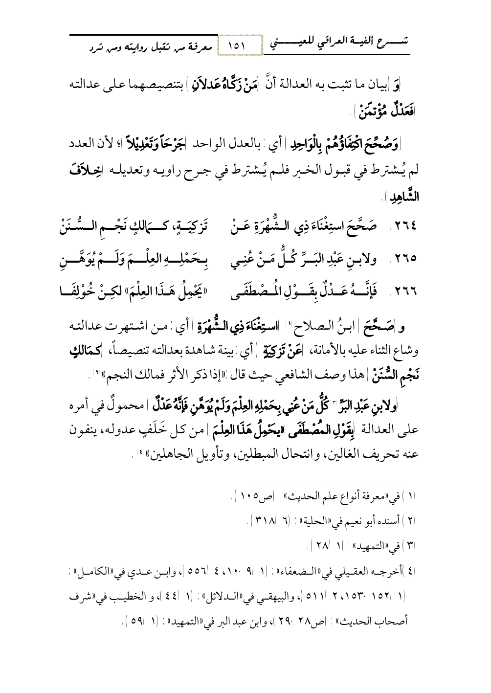 266 - فَإنَّهُ عَدْلٌ بِقَوْلِ المُصْطَفَى ... «يَحْمِلُ هَذَا العِلْمَ» لكِنْ خُوْلِفَا