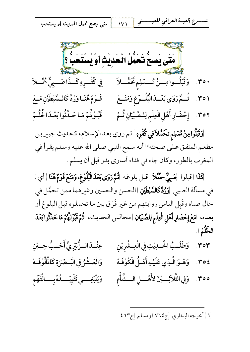 350 - وَقَبَلُوا مِنْ مُسْلِمٍ تَحَمُّلاَ ... فِي كُفْرِهِ كَذَا صَبِيٌّ حُمِّلاَ