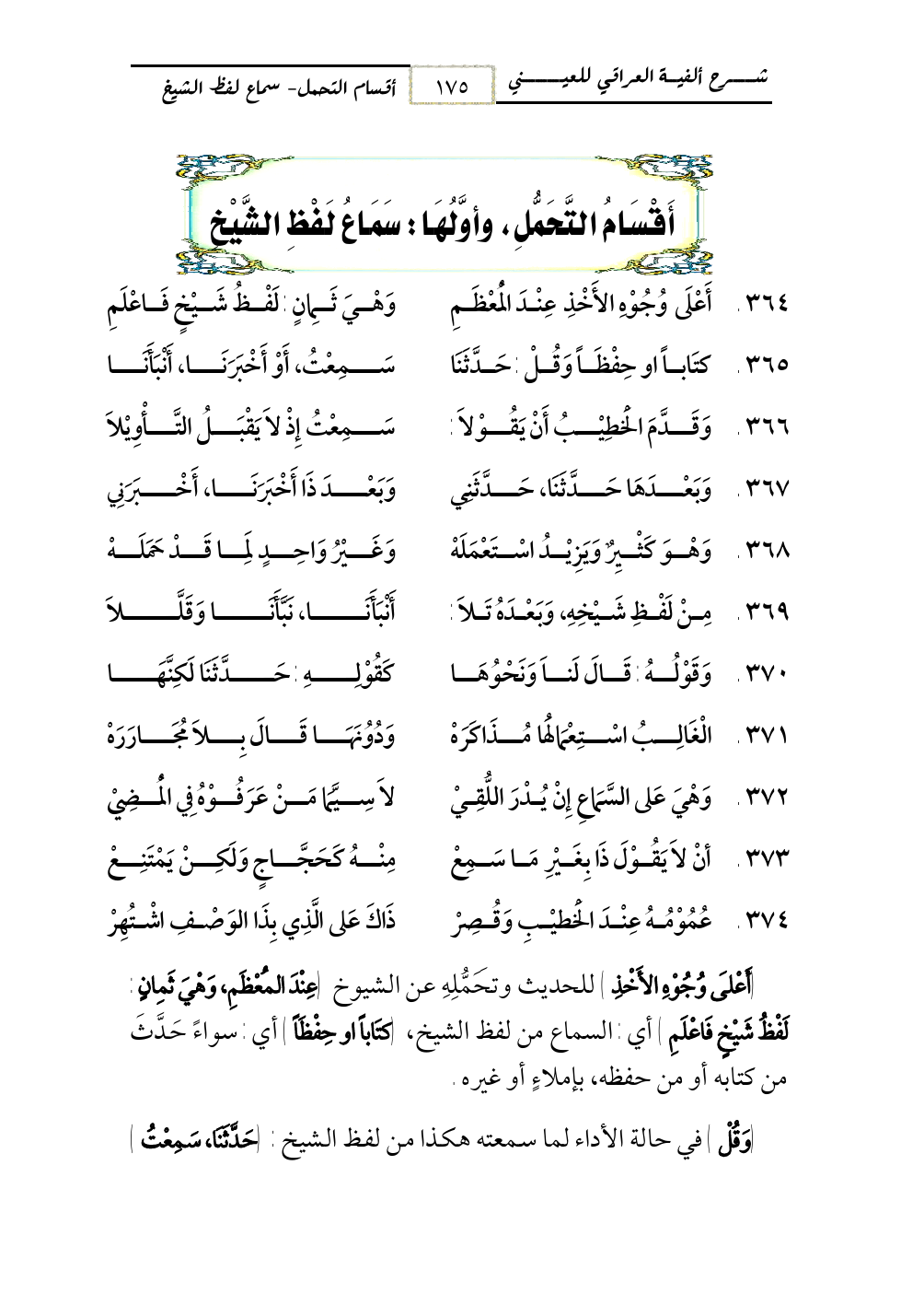 364 - أَعْلَى وُجُوْهِ الأَخْذِ عِنْدَ الْمُعْظَمِ ... وَهْيَ ثَمِانٍ: لَفْظُ شَيْخٍ فَاعْلَمِ