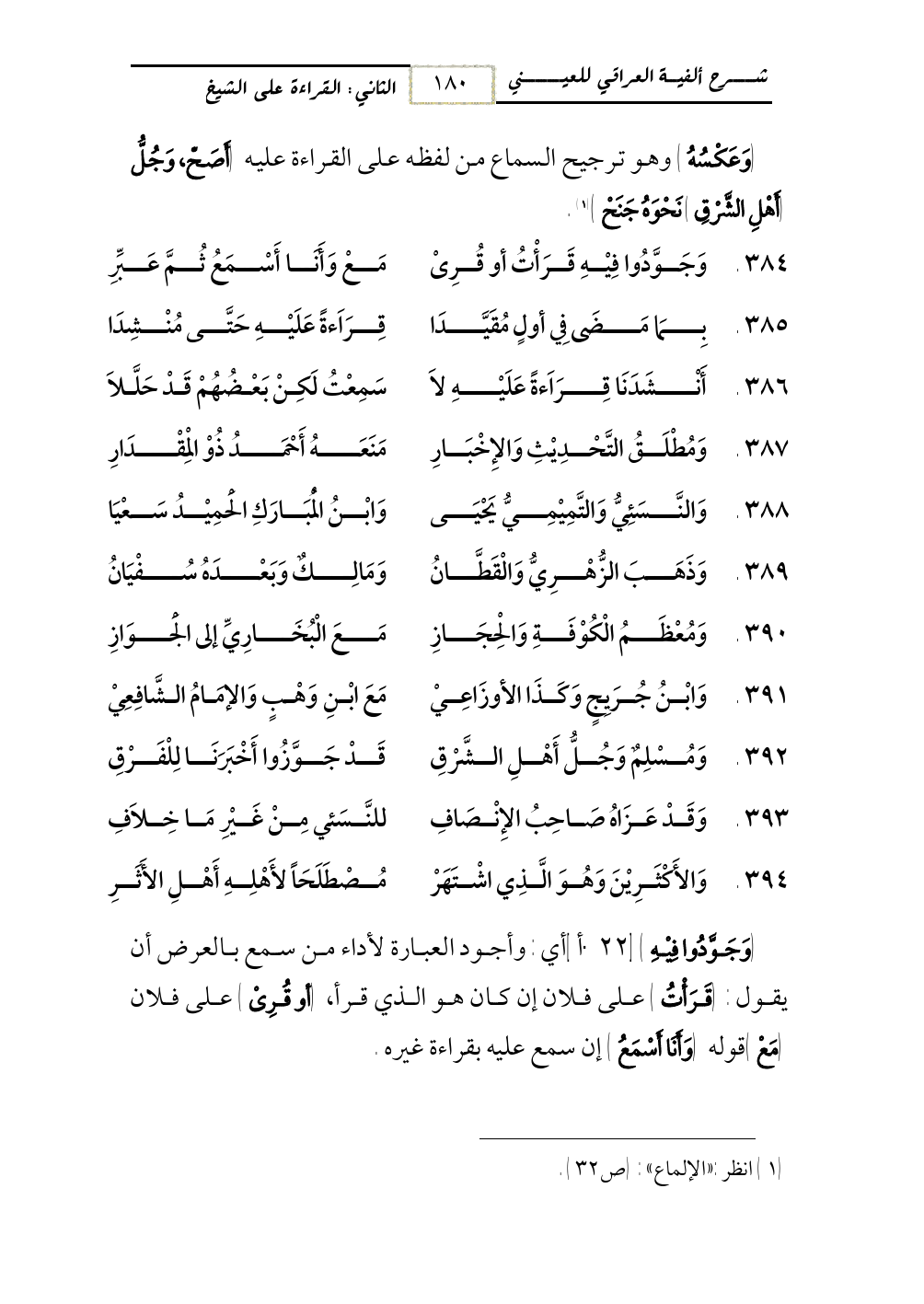 (وَعَكْسُهُ) وهو ترجيح السماع من لفظه على القراءة عليه (أَصَحّْ، وَجُلُّ (أَهْلِ الشَّرْقِ) نَحْوَهُ جَنَحْ) (¬1).