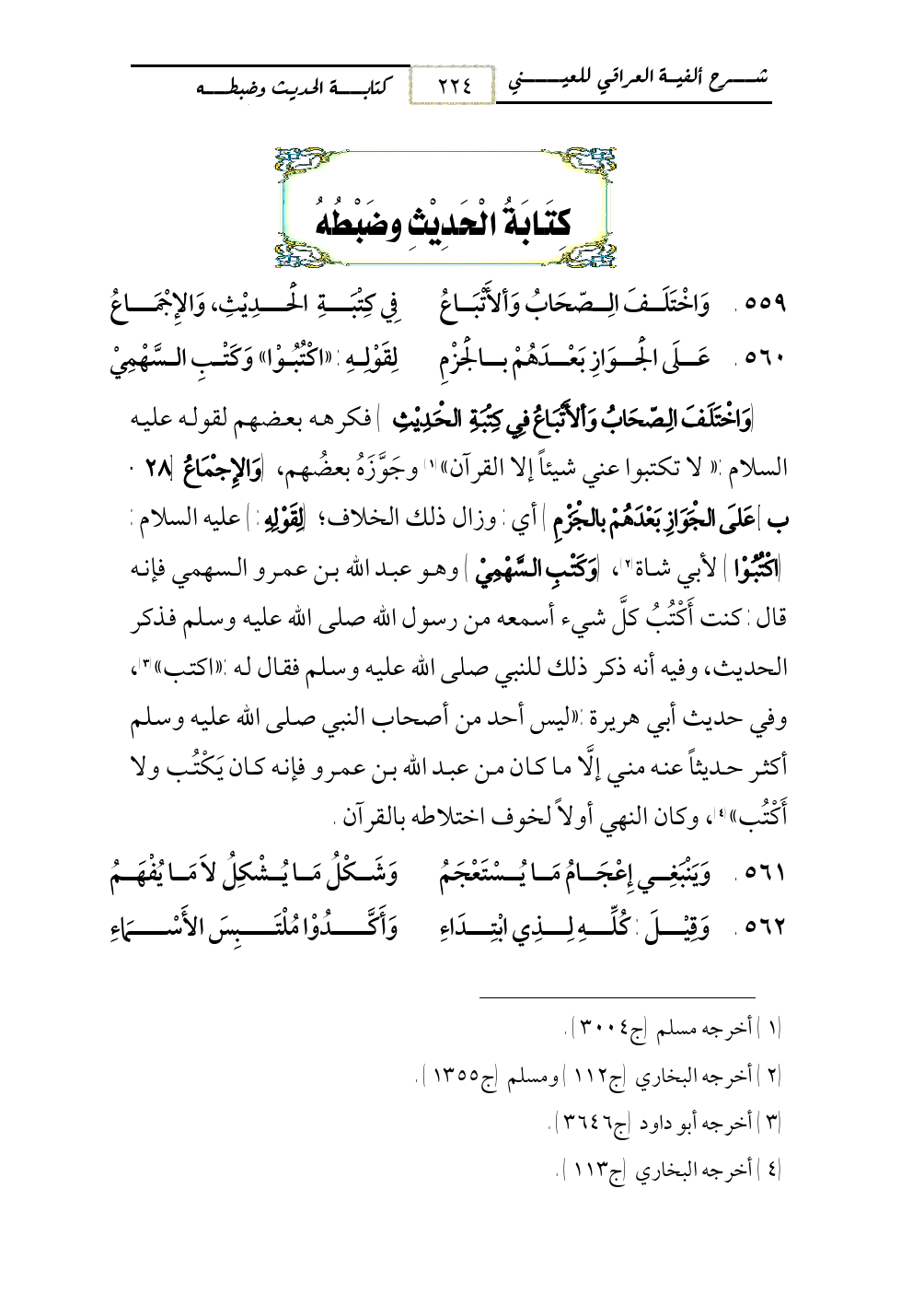 559 - وَاخْتَلَفَ الِصّحَابُ وَألأَتْبَاعُ ... فِي كِتْبَةِ الْحَدِيْثِ، وَالإِجْمَاعُ
