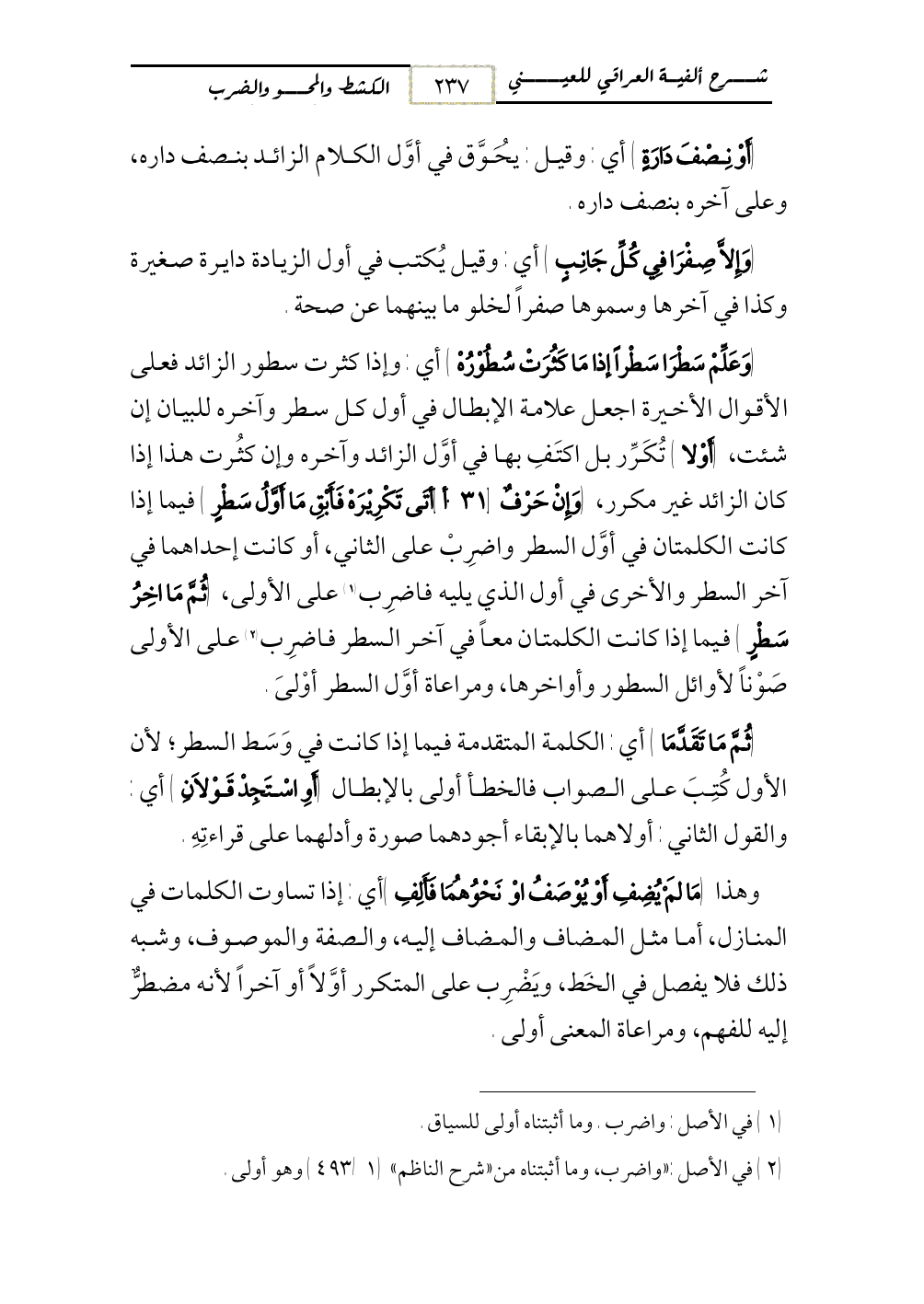 (وَعَلِّمْ سَطْرَا سَطْراً إذا مَا كَثُرَتْ سُطُوْرُهْ) أي: وإذا كثرت سطور الزائد فعلى الأقوال الأخيرة اجعل علامة الإبطال في أول كل سطر وآخره للبيان إن شئت، (أَوْلا) تُكَرِّر بل اكتَفِ بها في أوَّل الزائد وآخره وإن كثُرت هذا إذا كان الزائد غير مكرر، (وَإِنْ حَرْفٌ [31 - أ] أتَى تَكْرِيْرَهْ فَأَبْقِ مَا أَوَّلُ سَطْرٍ) فيما إذا كانت الكلمتان في أوَّل السطر واضرِبْ على الثاني، أو كانت إحداهما في آخر السطر والأخرى في أول الذي يليه فاضرِب (¬1) على الأولى، (ثُمَّ مَا اخِرُ سَطْرٍ) فيما إذا كانت الكلمتان معاً في آخر السطر فاضرِب (¬2) على الأولى صَوْناً لأوائل السطور وأواخرها، ومراعاة أوَّل السطر أوْلىَ.