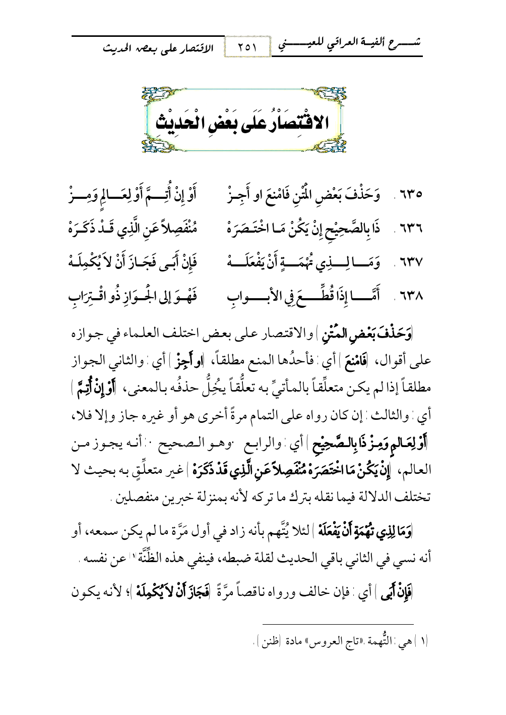 (وَحَذْفَ بَعْضِ الْمَتْنِ) والاقتصار على بعض اختلف العلماء في جوازه على أقوال، (فَامْنعَ) أي: فأحدُها المنع مطلقاً، (او أَجِزْ) أي: والثاني الجواز مطلقاً إذا لم يكن متعلِّقاً بالمأتيِّ به تعلُّقاً يُخِلُّ حذفُه بالمعنى، (أَوْ إِنْ أُتِمَّ) أي: والثالث: إن كان رواه على التمام مرةً أخرى هو أو غيره جاز وإلا فلا، (أَوْ لِعَالِمٍ وَمِزْ ذَا بِالصَّحِيْحِ) أي: والرابع -وهو الصحيح-: أنه يجوز من العالم، (إِنْ يَكُنْ مَا اخْتَصَرَهْ مُنْفَصِلاً عَنِ الَّذِي قَدْ ذَكَرَهْ) غير متعلِّقٍ به بحيث لا تختلف الدلالة فيما نقله بترك ما تركه لأنه بمنزلة خبرين منفصلين.