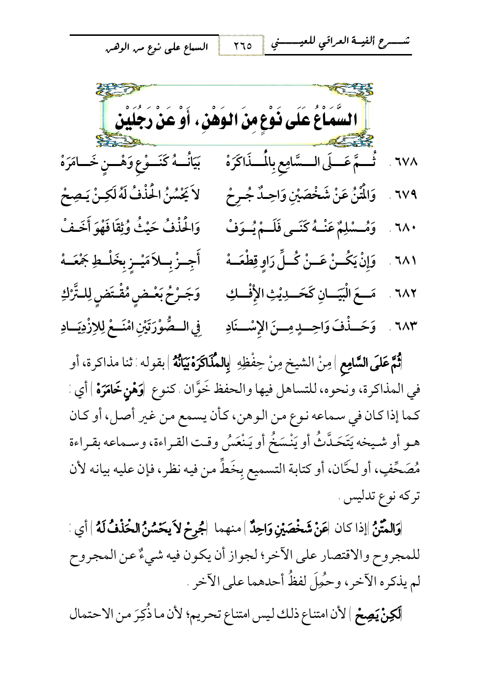 (ثُمَّ عَلَى السَّامِعِ) مِنْ الشيخ مِنْ حِفْظِهِ (بِالْمُذَاكَرَهْ بَيَانُهُ) بقوله: ثنا مذاكرة، أو في المذاكرة، ونحوه، للتساهل فيها والحفظ خَوَّان. كنوع (وَهْنٍ خَامَرَهْ) أي: كما إذا كان في سماعه نوع من الوهن، كأن يسمع من غير أصل، أو كان هو أو شيخه يَتَحَدَّثُ أو يَنْسَخُ أو يَنْعَسُ وقت القراءة، وسماعه بقراءة مُصَحِّفٍ، أو لَحَّان، أو كتابة التسميع بِخَطِّ من فيه نظر، فإن عليه بيانه لأن تركه نوع تدليس.