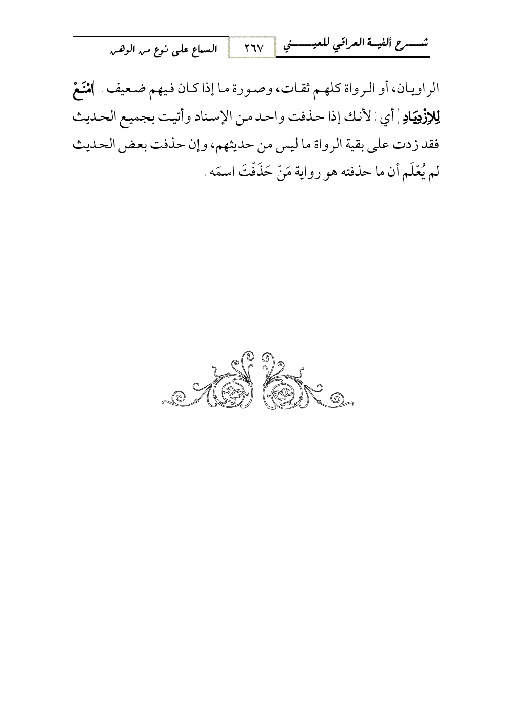 الراويان، أو الرواة كلهم ثقات، وصورة ما إذا كان فيهم ضعيف. (امْنَعْ لِلاِزْدِيَادِ) أي: لأنك إذا حذفت واحد من الإسناد وأتيت بجميع الحديث فقد زدت على بقية الرواة ما ليس من حديثهم، وإن حذفت بعض الحديث لم يُعْلَم أن ما حذفته هو رواية مَنْ حَذَفْتَ اسمَه.