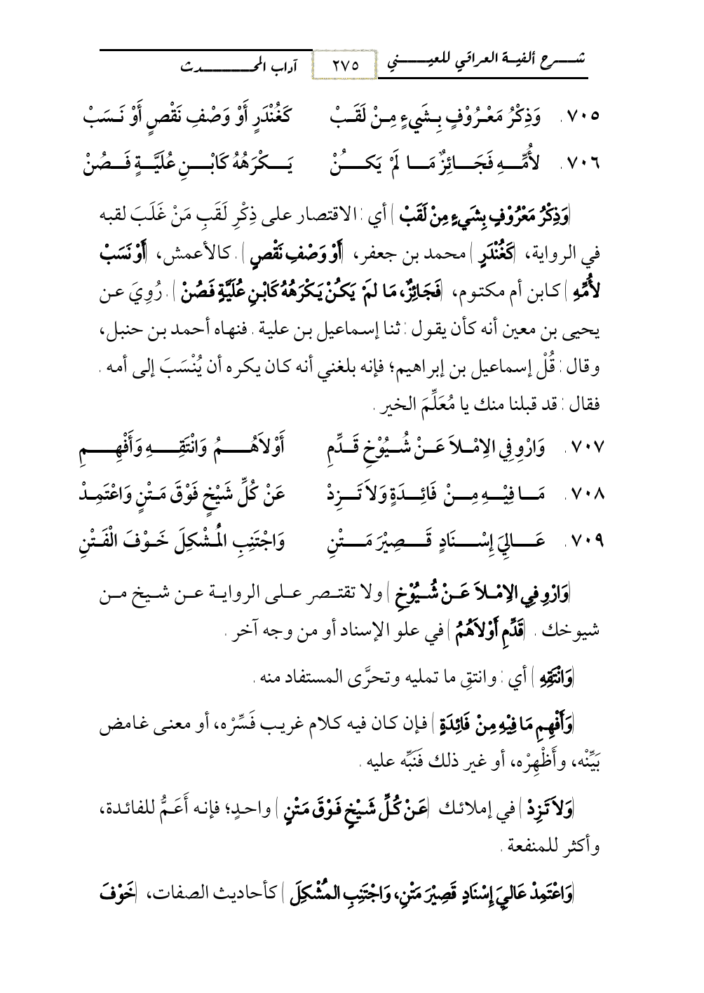 (وَذِكْرُ مَعْرُوْفٍ بِشَيءٍ مِنْ لَقَبْ) أي: الاقتصار على ذِكْرِ لَقَبِ مَنْ غَلَبَ لقبه في الرواية، (كَغُنْدَرٍ) محمد بن جعفر، (أَوْ وَصْفِ نَقْصٍ). كالأعمش، (أَوْ نَسَبْ لأُمِّهِ) كابن أم مكتوم، (فَجَائِزٌ، مَا لَمْ يَكُنْ يَكْرَهُهُ كَابْنِ عُلَيَّةٍ فَصُنْ). رُوِيَ عن يحيى بن معين أنه كأن يقول: ثنا إسماعيل بن علية. فنهاه أحمد بن حنبل، وقال: قُلْ إسماعيل بن إبراهيم؛ فإنه بلغني أنه كان يكره أن يُنْسَبَ إلى أمه. فقال: قد قبلنا منك يا مُعَلِّمَ الخير.