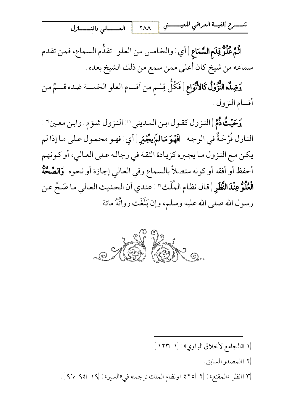 (وَحَيْثُ ذُمَّ) النزول كقول ابن المديني (¬1): النزول شؤم. وابن معين (¬2): النازل قُرْحَةٌ في الوجه. (فَهْوَ مَا لَمْ يُجْبَرِ) أي: فهو محمول على ما إذا لم يكن مع النزول ما يجبره كزيادة الثقة في رجاله على العالي، أو كونهم أحفظ أو أفقه أو كونه متصلاً بالسماع وفي العالي إجازة أو نحوه (وَالصِّحَّةُ الْعُلُوُّ عِنْدَ النَّظَرِ) قال نظام المُلْك (¬3): عندي أن الحديث العالي ما صَحَّ عن رسول الله صلى الله عليه وسلم، وإن بَلَغَت رواتُهُ مائة.