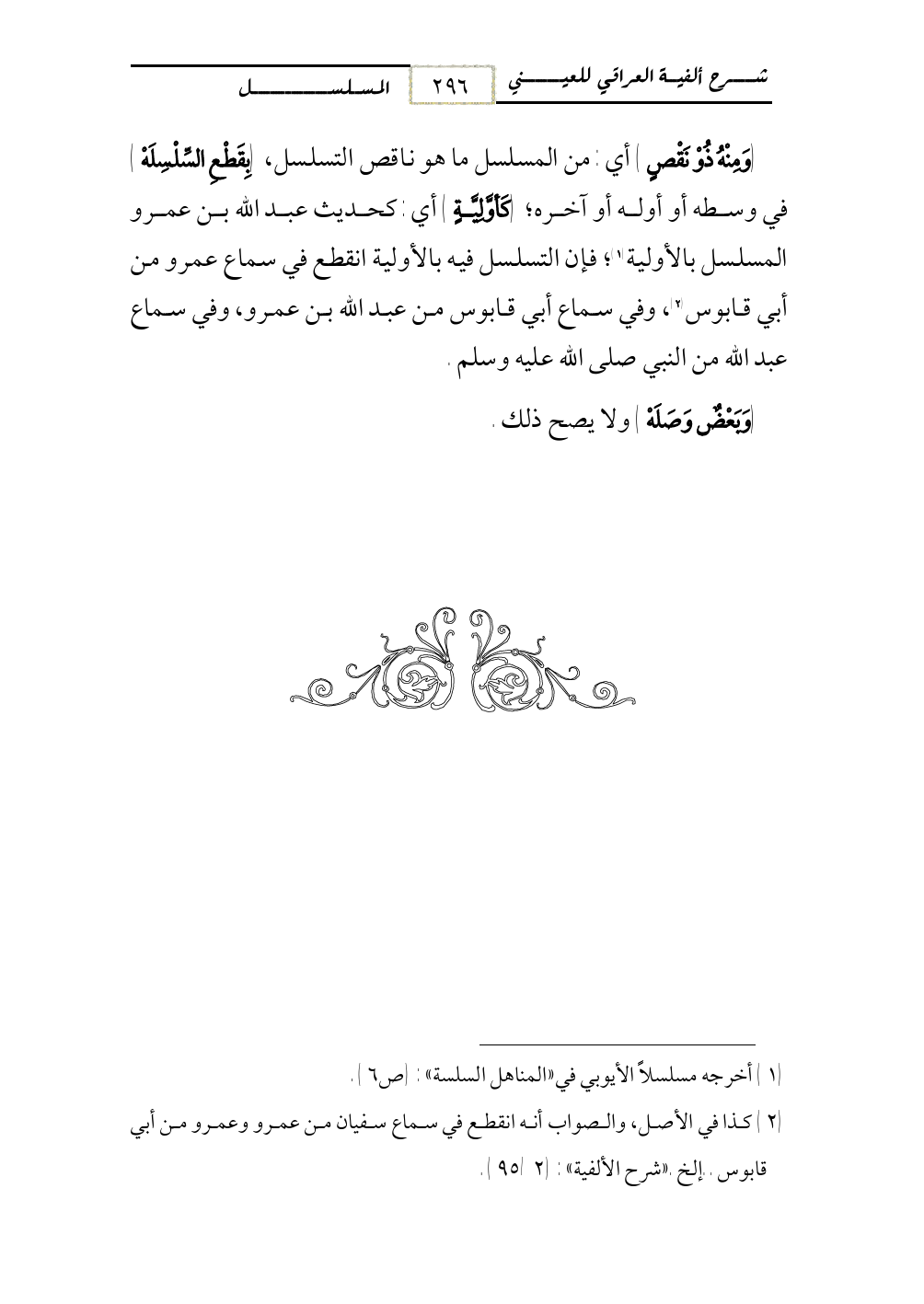 (وَمِنْهُ ذُوْ نَقْصٍ) أي: من المسلسل ما هو ناقص التسلسل، (بِقَطْعِ السِّلْسِلَهْ) في وسطه أو أوله أو آخره؛ (كَأوَّلِيَّةٍ) أي: كحديث عبد الله بن عمرو المسلسل بالأولية (¬1)؛ فإن التسلسل فيه بالأولية انقطع في سماع عمرو من أبي قابوس (¬2)، وفي سماع أبي قابوس من عبد الله بن عمرو، وفي سماع عبد الله من النبي صلى الله عليه وسلم.