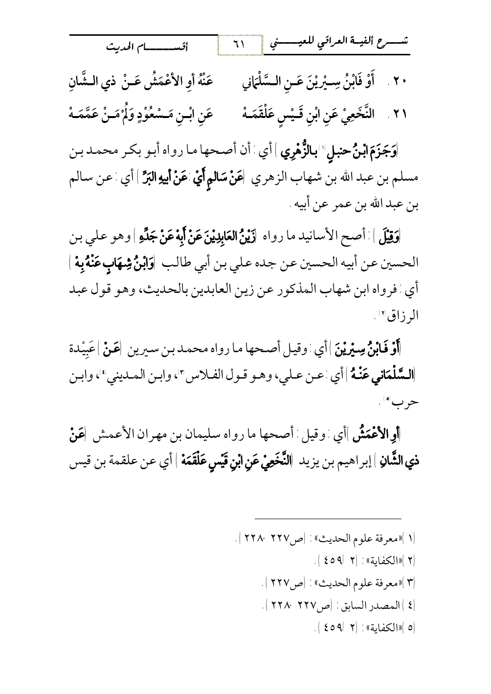 20 - أَوْ فَابْنُ سِيْريْنَ عَنِ السَّلْمَاني ... عَنْهُ أوِ الأعْمَشُ عَنْ ذي الشَّانِ