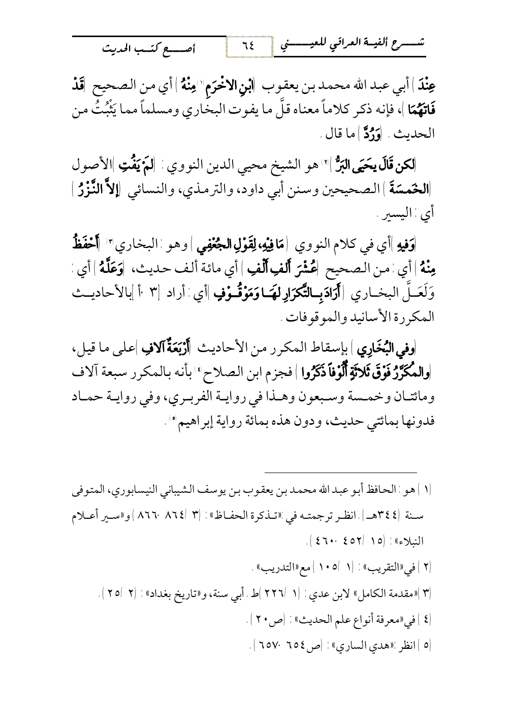 (لكن قَالَ يَحيَى البَرُّ) (¬2) هو الشيخ محيي الدين النووي: (لَمْ يَفُتِ) الأصول (الخَمسَةَ) الصحيحين وسنن أبي داود، والترمذي، والنسائي (إلاَّ النَّزْرُ) أي: اليسير.