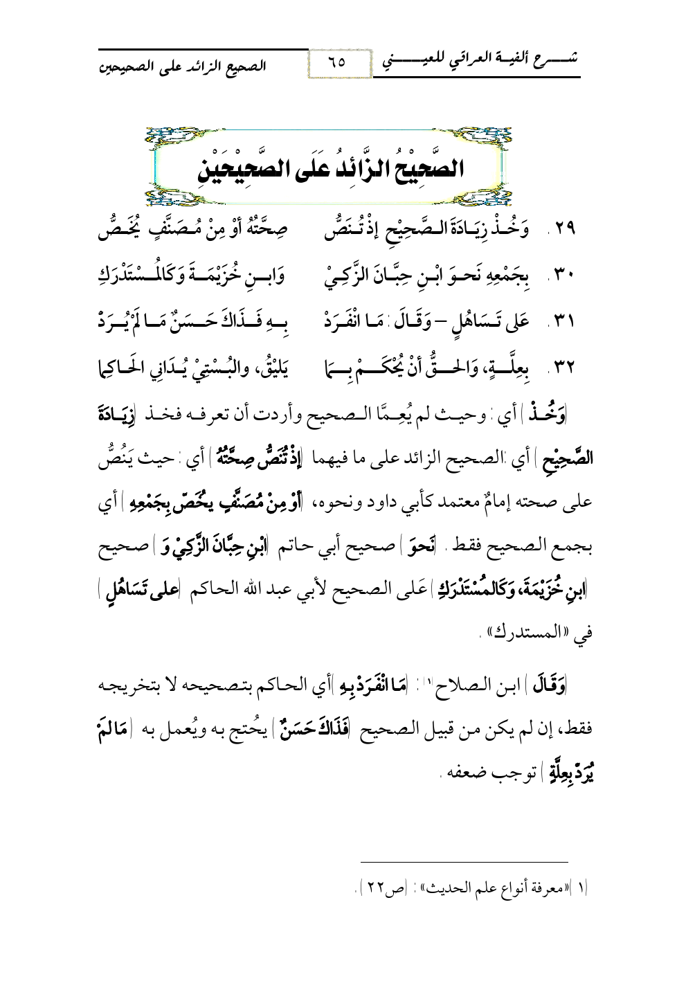 (وَخُذْ) أي: وحيث لم يُعِمَّا الصحيح وأردت أن تعرفه فخذ (زِيَادَةَ الصَّحِيْحِ) أي: الصحيح الزائد على ما فيهما (إذْ تُنَصُّ صِحَّتُهُ) أي: حيث يَنُصُّ على صحته إمامٌ معتمد كأبي داود ونحوه، (أوْ مِنْ مُصَنَّفٍ يُخَصّ بِجَمْعِهِ) أي بجمع الصحيح فقط. (نَحوَ) صحيح أبي حاتم (ابْنِ حِبَّانَ الزَّكِيْ وَ) صحيح (ابنِ خُزَيْمَةَ، وَكَالمُسْتَدْرَكِ) عَلى الصحيح لأبي عبد الله الحاكم (على تَسَاهُلٍ) في «المستدرك».