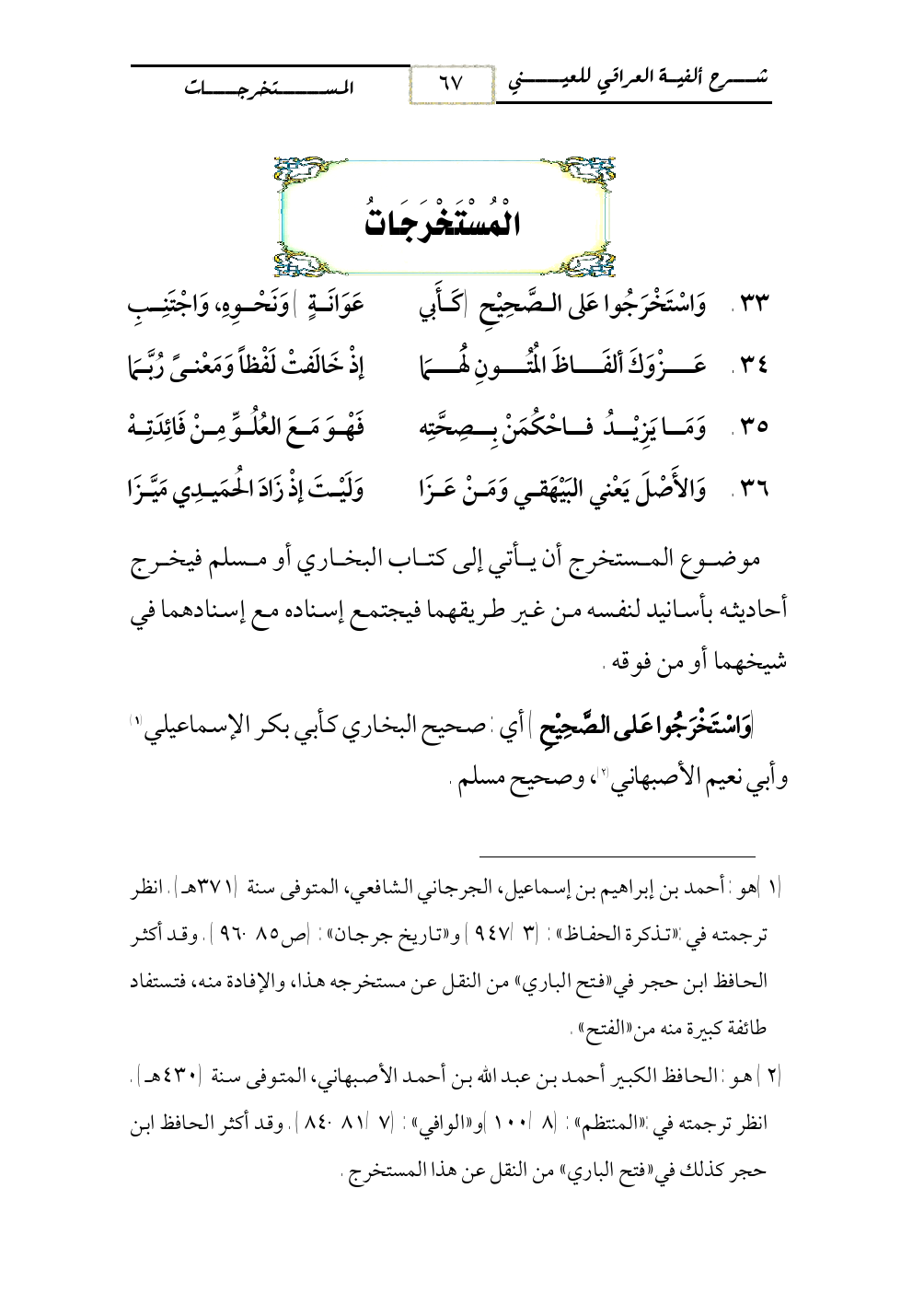 33 - وَاسْتَخْرَجُوا عَلى الصَّحِيْحِ (كَأَبي ... عَوَانَةٍ) وَنَحْوِهِ، وَاجْتَنِبِ