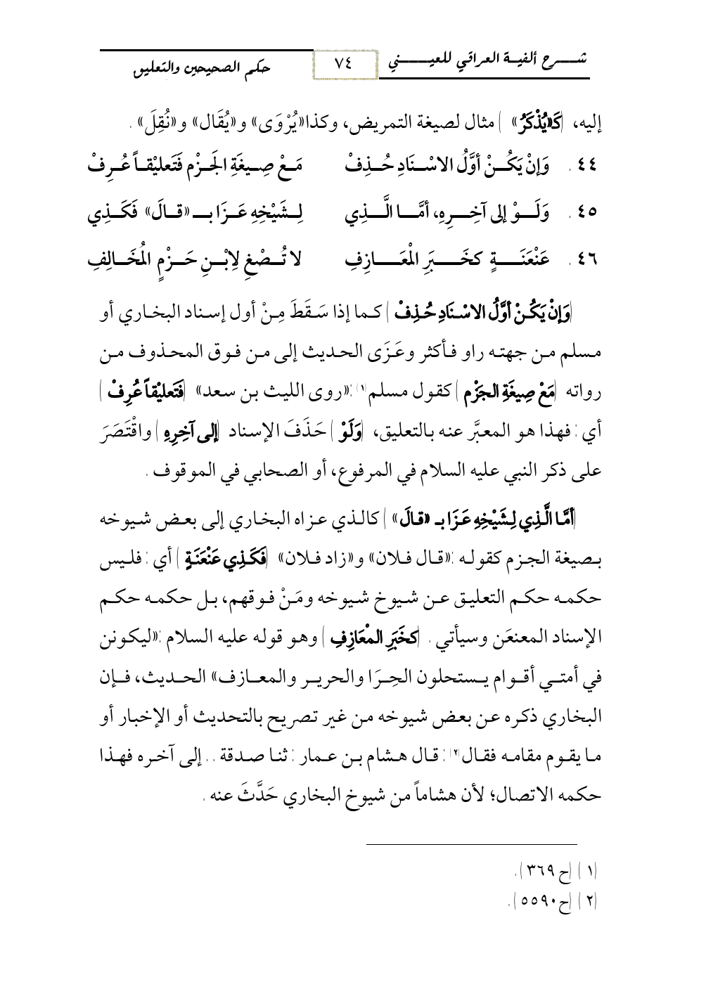 44 - وَإنْ يَكُنْ أوَّلُ الاسْنَادِ حُذِفْ ... مَعْ صِيغَةِ الجَزْم فَتَعليْقاً عُرِفْ