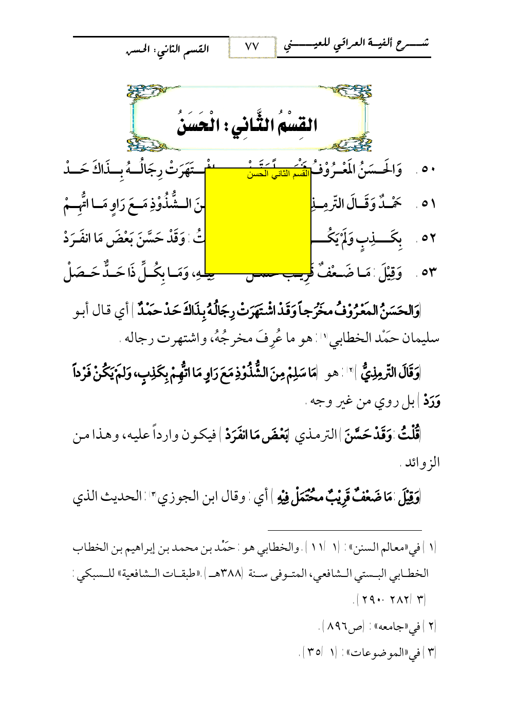 51 - حَمْدٌ وَقَالَ التّرمِذِيُّ: مَا سَلِمْ ... مِنَ الشُّذُوْذِ مَعَ رَاوٍ مَا اتُّهِمْ