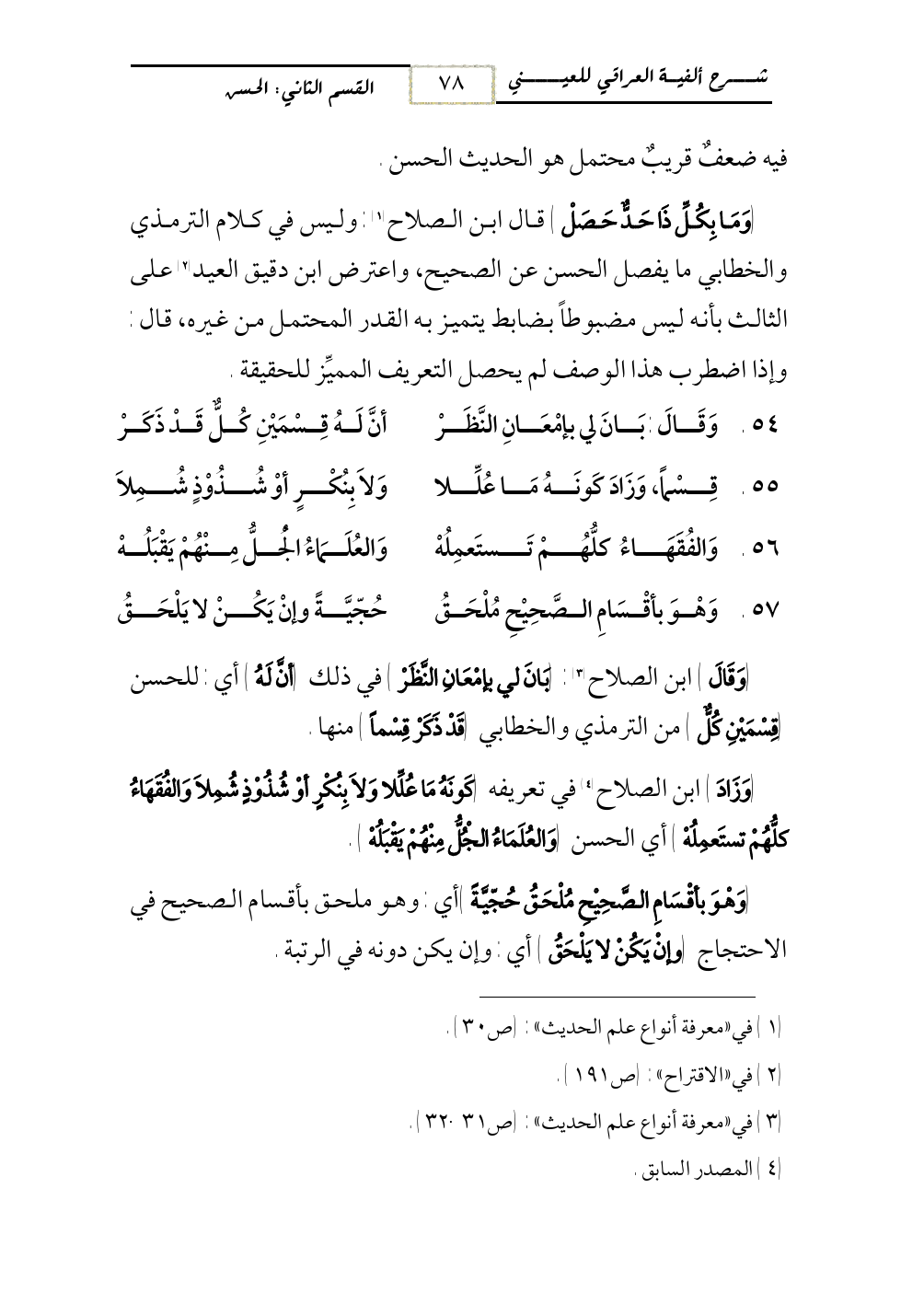 (وَزَادَ) ابن الصلاح (¬4) في تعريفه (كَونَهُ مَا عُلِّلا وَلاَ بِنُكْرٍ أوْ شُذُوْذٍ شُمِلاَ وَالفُقَهَاءُ كلُّهُمْ تستَعمِلُهْ) أي الحسن (وَالعُلَمَاءُ الْجُلُّ مِنْهُمْ يَقْبَلُهْ).