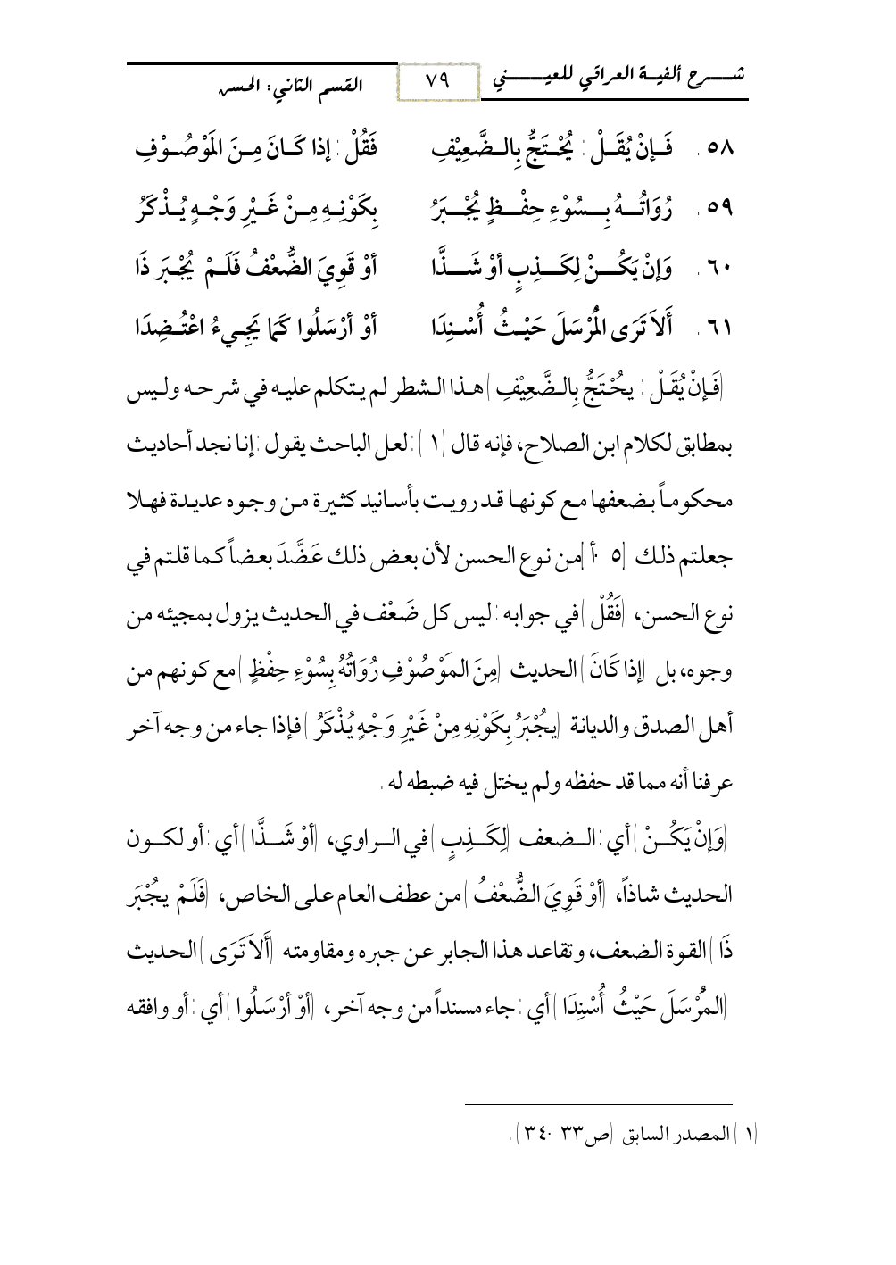 58 - فَإنْ يُقَلْ: يُحْتَجُّ بِالضَّعِيْفِ ... فَقُلْ: إذا كَانَ مِنَ المَوْصُوْفِ
