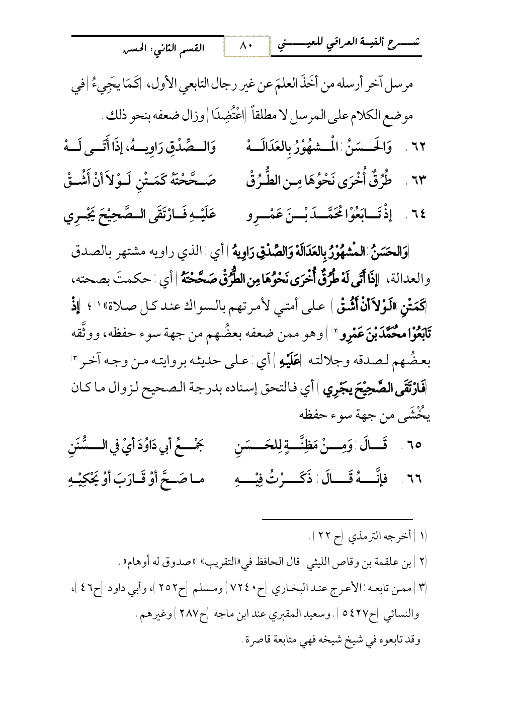 (وَالحَسَنُ: الْمشهُوْرُ بِالعَدَالَهْ وَالصِّدْقِ رَاوِيهُ) أي: الذي راويه مشتهر بالصدق والعدالة، (إذَا أَتَى لَهْ طُرُقٌ أُخْرَى نَحْوُهَا مِن الطُّرُقْ صَحَّحْتَهُ) أي: حكمتَ بصحته، (كَمَتْنِ: «لَوْلاَ أنْ أَشُقْ) على أمتي لأمرتهم بالسواك عند كل صلاة» (¬1)؛ (إذْ تَابَعُوْا مُحَمَّدَ بْنَ عَمْرِو (¬2)) وهو ممن ضعفه بعضُهم من جهة سوء حفظه، ووثَّقه بعضُهم لصدقه وجلالته (عَلَيْهِ) أي: على حديثه بروايته من وجه آخر (¬3) (فَارْتَقَى الصَّحِيْحَ يَجْرِي) أي فالتحق إسناده بدرجة الصحيح لزوال ما كان يُخْشَى من جهة سوء حفظه.