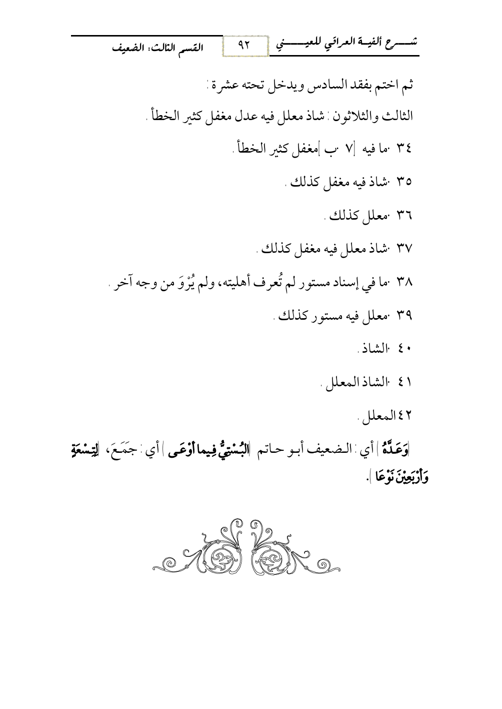 (وَعَدَّهُ) أي: الضعيف أبو حاتم (البُسْتِيُّ فِيما أوْعَى) أي: جَمَعَ، (لِتِسْعَةٍ وَأرْبَعِيْنَ نَوْعَا).