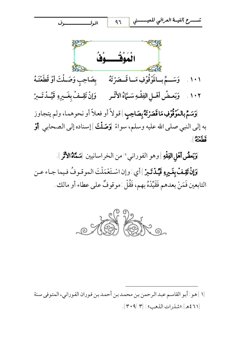 101 - وَسَمِّ بالمَوْقُوْفِ مَا قَصَرْتَهُ ... بِصَاحِبٍ وَصَلْتَ أوْ قَطَعْتَهُ