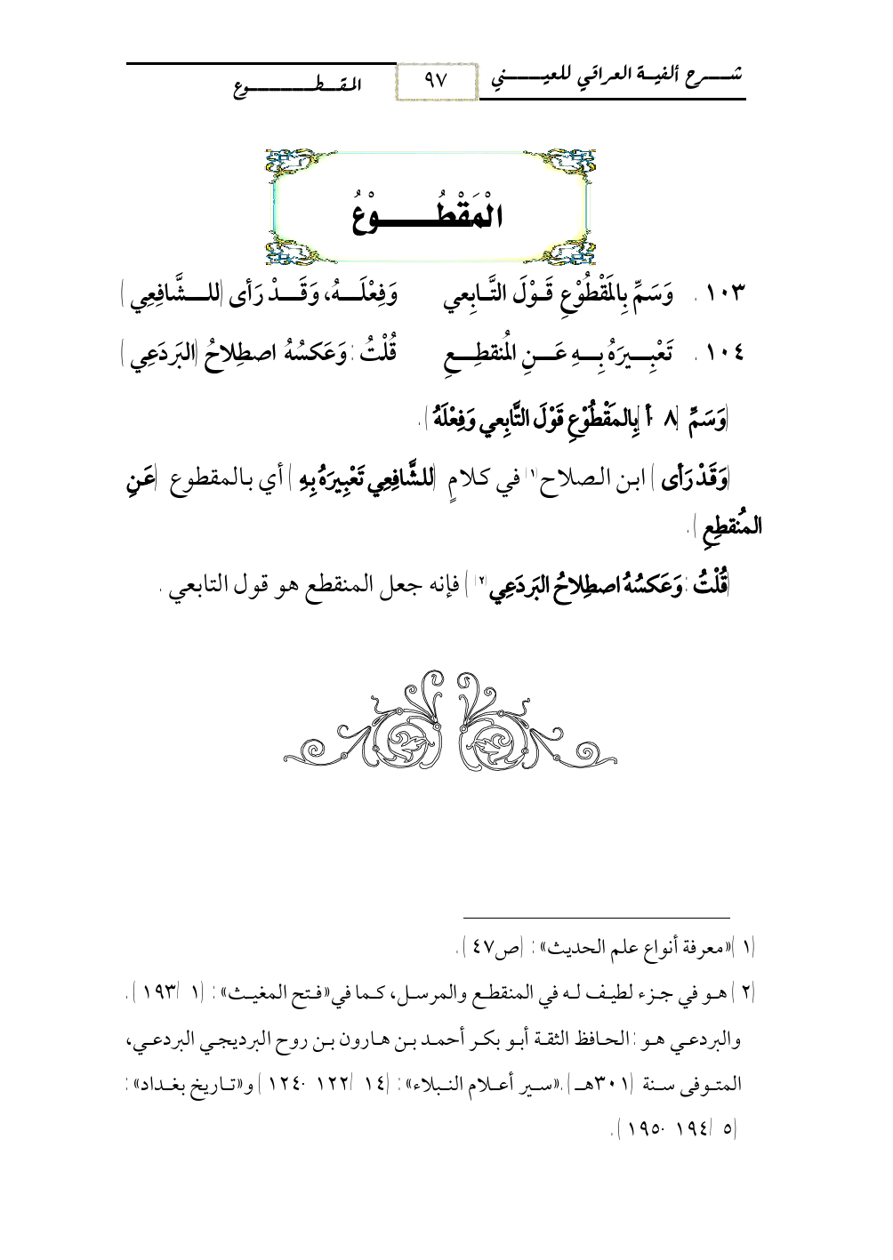 (قُلْتُ: وَعَكسُهُ اصطِلاحُ البَردَعِي (¬2)) فإنه جعل المنقطع هو قول التابعي.