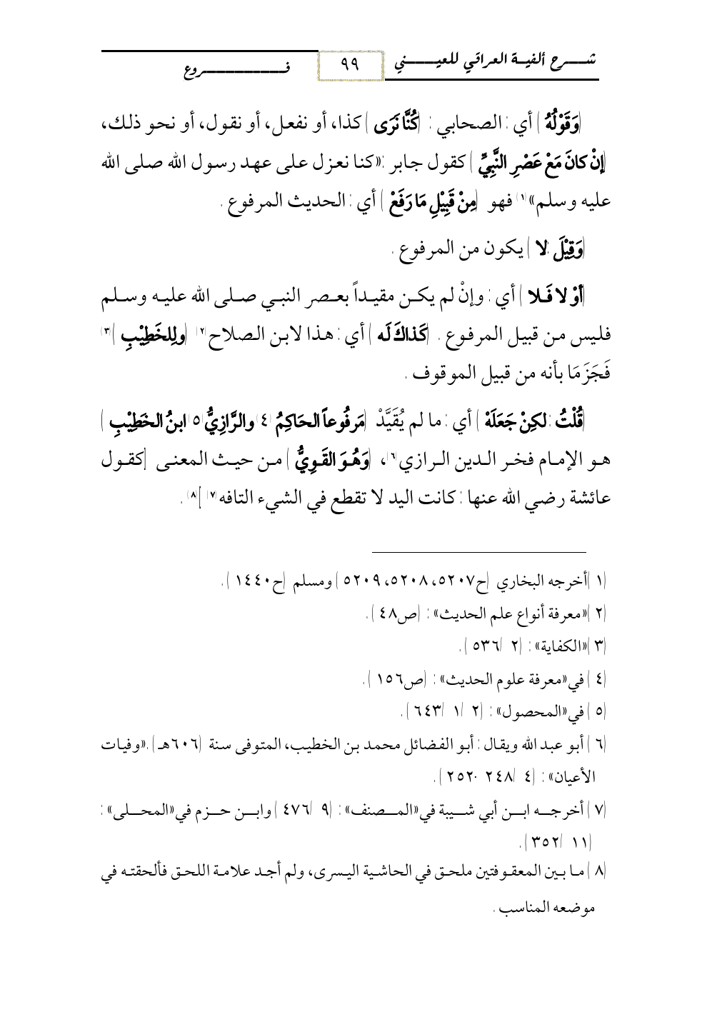 (قُلْتُ: لكِنْ جَعَلَهْ) أي: ما لم يُقَيَّدْ (مَرفُوعاً الحَاكِمُ (¬4) والرَّازِيُّ (¬5) ابنُ الخَطِيْبِ) هو الإمام فخر الدين الرازي (¬6)، (وَهُوَ القَوِيُّ) من حيث المعنى [كقول عائشة رضي الله عنها: كانت اليد لا تقطع في الشيء التافه (¬7)] (¬8).