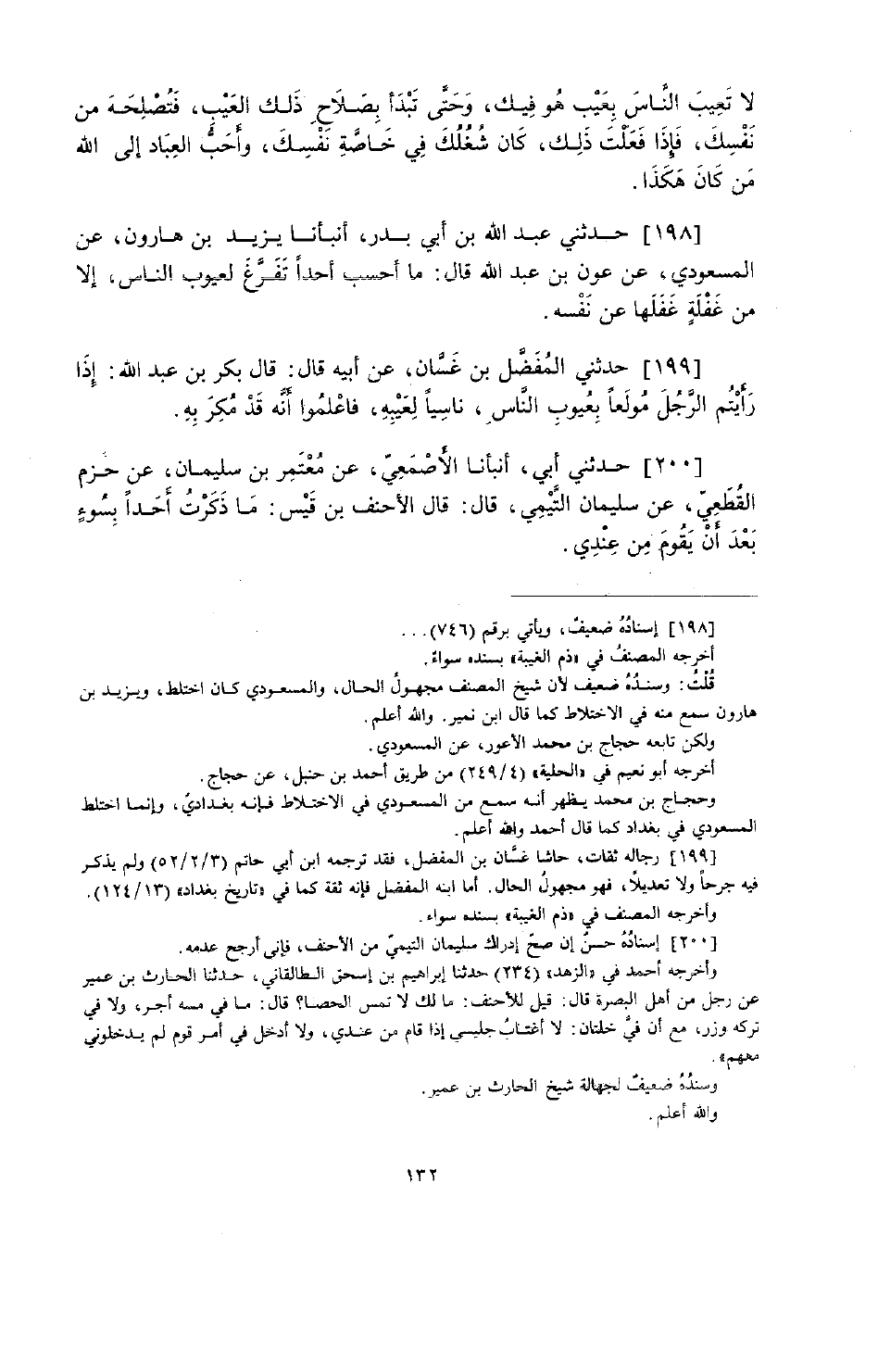 198 - حَدَّثَنِي عَبْدُ اللَّهِ بْنُ أَبِي بَدْرٍ، أَخْبَرَنَا يَزِيدُ بْنُ هَارُونَ، عَنِ الْمَسْعُودِيِّ، عَنْ عَوْنِ بْنِ عَبْدِ اللَّهِ قَالَ: «§مَا أَحْسِبُ أَحَدًا تَفَرَّغَ لِعُيُوبِ النَّاسِ، إِلَّا مِنْ غَفْلَةٍ غَفَلَهَا عَنْ نَفْسِهِ»