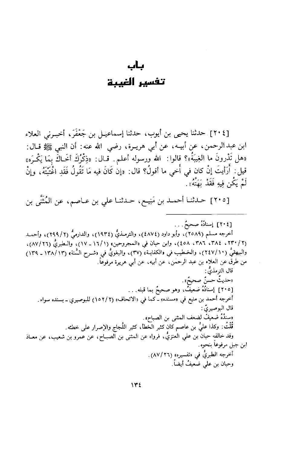 حَدَّثَنَا يَحْيَى بْنُ أَيُّوبَ، حَدَّثَنَا إِسْمَاعِيلُ بْنُ جَعْفَرٍ، أَخْبَرَنِي الْعَلَاءُ بْنُ عَبْدِ الرَّحْمَنِ، عَنْ أَبِيهِ، عَنْ أَبِي هُرَيْرَةَ رَضِيَ اللَّهُ عَنْهُ، أَنَّ النَّبِيَّ صَلَّى اللهُ عَلَيْهِ وَسَلَّمَ قَالَ: «هَلْ تَدْرُونَ مَا الْغِيبَةُ؟» قَالُوا: اللَّهُ وَرَسُولُهُ أَعْلَمُ. قَالَ: «§ذِكْرُكَ أَخَاكَ بِمَا يَكْرَهُ» . قِيلَ: أَرَأَيْتَ إِنْ كَانَ فِي أَخِي مَا أَقُولُهُ؟ قَالَ: «إِنْ كَانَ فِيهِ مَا تَقُولُ فَقَدِ اغْتَبْتَهُ، وَإِنْ لَمْ يَكُنْ فِيهِ فَقَدْ بَهَتَّهُ»