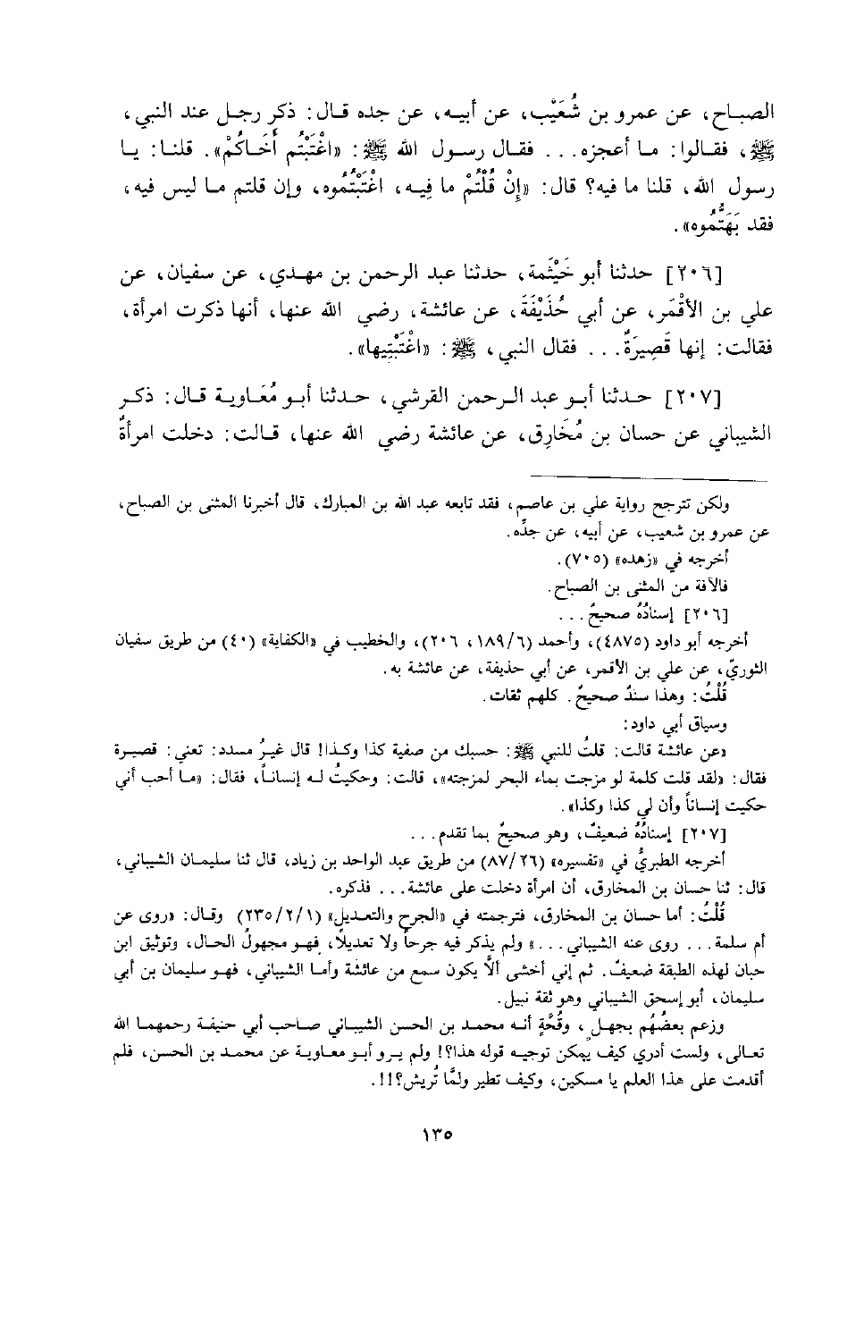 207 - حَدَّثَنَا أَبُو عَبْدِ الرَّحْمَنِ الْقُرَشِيُّ، حَدَّثَنَا أَبُو مُعَاوِيَةَ، قَالَ: ذَكَرَ الشَّيْبَانِيُّ، عَنْ حَسَّانَ بْنِ مُخَارِقٍ، عَنْ عَائِشَةَ رَضِيَ اللَّهُ عَنْهَا قَالَتْ: دَخَلَتِ امْرَأَةٌ -[136]- قَصِيرَةٌ، وَالنَّبِيُّ صَلَّى اللهُ عَلَيْهِ وَسَلَّمَ جَالِسٌ، فَقُلْتُ بِإِبْهَامِي هَكَذَا، §وَأَشَرْتُ إِلَى النَّبِيِّ صَلَّى اللهُ عَلَيْهِ وَسَلَّمَ أَنَّهَا قَصِيرَةٌ. فَقَالَ النَّبِيُّ صَلَّى اللهُ عَلَيْهِ وَسَلَّمَ: «اغْتَبْتِهَا»