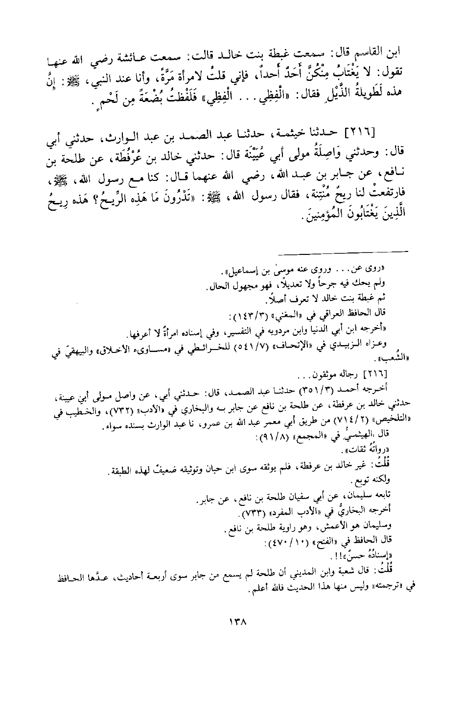 216 - حَدَّثَنَا أَبُو خَيْثَمَةَ، حَدَّثَنَا عَبْدُ الصَّمَدِ بْنُ عَبْدِ الْوَارِثِ، حَدَّثَنِي أَبِي، قَالَ: وَحَدَّثَنِي وَاصِلٌ، مَوْلَى أَبِي عُيَيْنَةَ قَالَ: حَدَّثَنِي خَالِدُ بْنُ عُرْفُطَةَ، عَنْ طَلْحَةَ بْنِ نَافِعٍ، عَنْ جَابِرِ بْنِ عَبْدِ اللَّهِ رَضِيَ اللَّهُ عَنْهُمَا قَالَ: كُنَّا مَعَ رَسُولِ اللَّهِ صَلَّى اللهُ عَلَيْهِ وَسَلَّمَ، فَارْتَفَعَتْ لَنَا رِيحٌ مُنْتِنَةٌ، فَقَالَ رَسُولُ اللَّهِ صَلَّى اللهُ عَلَيْهِ وَسَلَّمَ: «§تَدْرُونَ مَا هَذِهِ الرِّيحُ؟ هَذِهِ رِيحُ الَّذِينَ يَغْتَابُونَ الْمُؤْمِنِينَ»