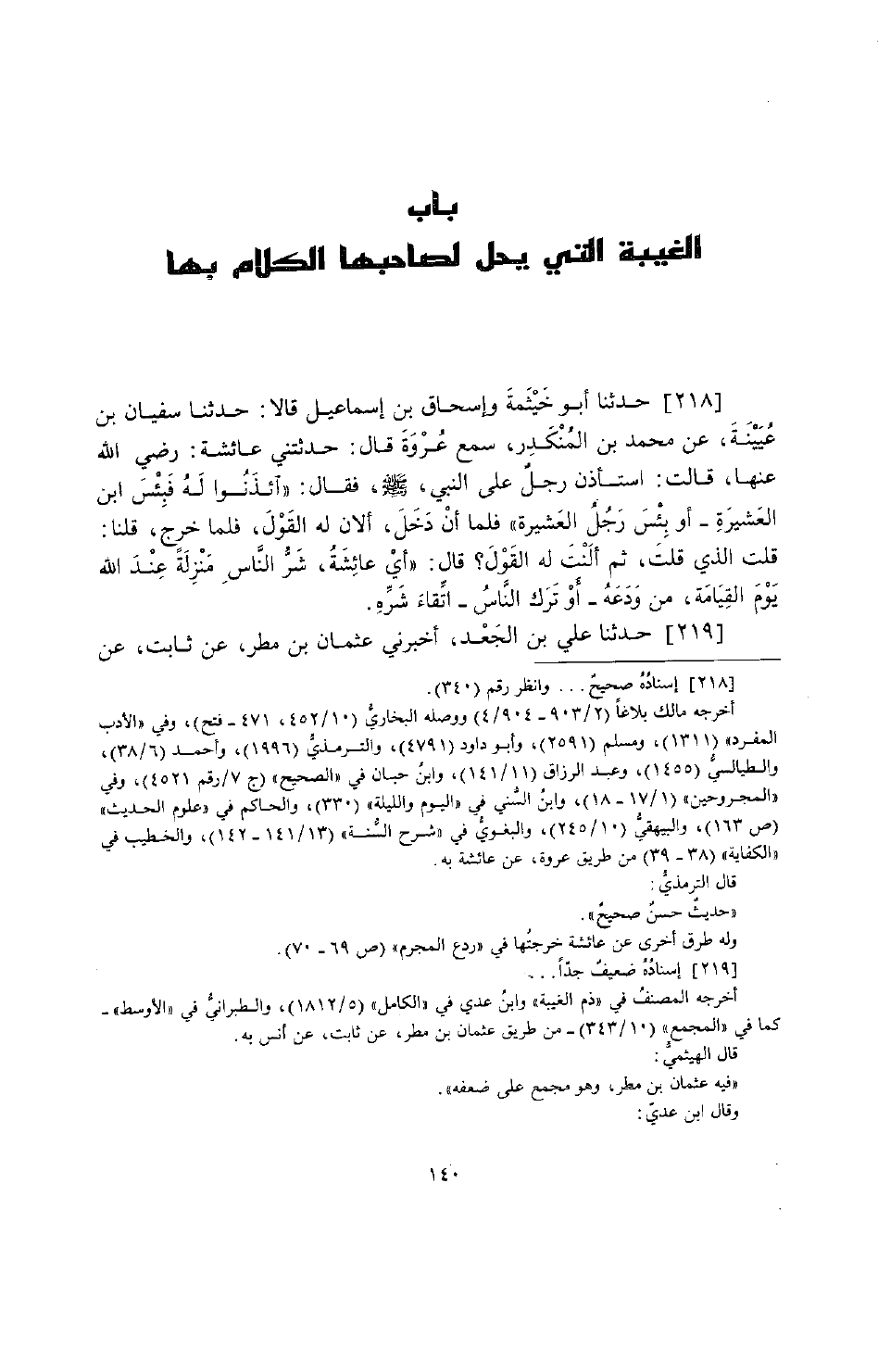 218 - حَدَّثَنَا أَبُو خَيْثَمَةَ، وَإِسْحَاقُ بْنُ إِسْمَاعِيلَ، قَالَا: حَدَّثَنَا سُفْيَانُ بْنُ عُيَيْنَةَ، عَنْ مُحَمَّدِ بْنِ الْمُنْكَدِرِ، سَمِعَ عُرْوَةَ قَالَ: حَدَّثَتْنِي عَائِشَةُ رَضِيَ اللَّهُ عَنْهَا قَالَتِ: اسْتَأْذَنَ رَجُلٌ عَلَى النَّبِيِّ صَلَّى اللهُ عَلَيْهِ وَسَلَّمَ فَقَالَ: «ائْذَنُوا لَهُ، فَبِئْسَ ابْنُ الْعَشِيرَةِ، أَوْ بِئْسَ رَجُلُ الْعَشِيرَةِ» ، فَلَمَّا أَنْ دَخَلَ أَلَانَ لَهُ الْقَوْلَ، فَلَمَّا خَرَجَ قُلْنَا: قُلْتَ الَّذِي قُلْتَ، ثُمَّ أَلَنْتَ لَهُ الْقَوْلَ؟ قَالَ: «أَيْ عَائِشَةُ، §شَرُّ النَّاسِ مَنْزِلَةً عِنْدَ اللَّهِ يَوْمَ الْقِيَامَةِ مَنْ وَدَعَهُ - أَوْ تَرَكَهُ - النَّاسُ اتِّقَاءَ شَرِّهِ»