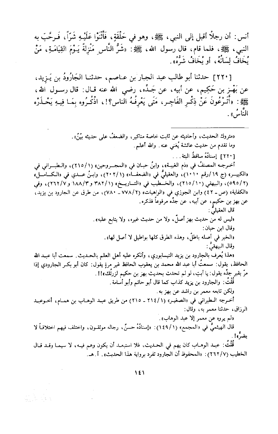 220 - حَدَّثَنَا أَبُو طَالِبٍ عَبْدُ الْجَبَّارِ بْنُ عَاصِمٍ، حَدَّثَنَا الْجَارُودُ بْنُ يَزِيدَ، عَنْ بَهْزِ بْنِ حَكِيمٍ، عَنْ أَبِيهِ، عَنْ جَدِّهِ رَضِيَ اللَّهُ عَنْهُ قَالَ: قَالَ رَسُولُ اللَّهِ صَلَّى اللهُ عَلَيْهِ وَسَلَّمَ: «§أَتَرْعَوْنَ عَنْ ذِكْرِ الْفَاجِرِ؟ مَتَى يَعْرِفُهُ النَّاسُ؟ اذْكُرُوهُ بِمَا فِيهِ يَحْذَرْهُ النَّاسُ»