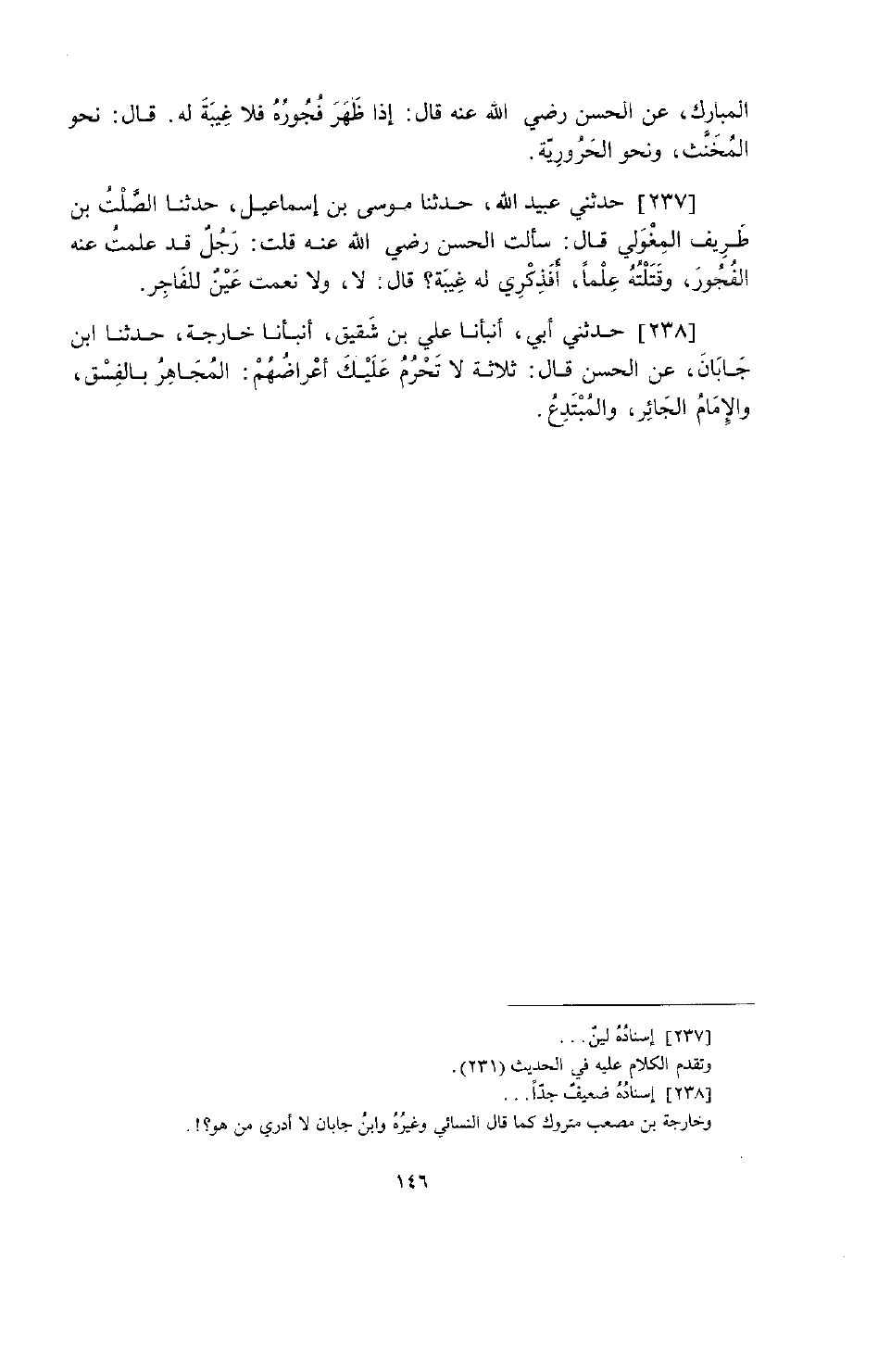 238 - حَدَّثَنِي أَبِي، أَخْبَرَنَا عَلِيُّ بْنُ شَقِيقٍ، أَخْبَرَنَا خَارِجَةُ، حَدَّثَنَا ابْنُ جَابَانَ، عَنِ الْحَسَنِ قَالَ: " §ثَلَاثَةٌ لَا تُحَرَّمُ عَلَيْكَ أَعْرَاضُهُمْ: الْمُجَاهِرُ بِالْفِسْقِ، وَالْإِمَامُ الْجَائِرُ، وَالْمُبْتَدِعُ "
