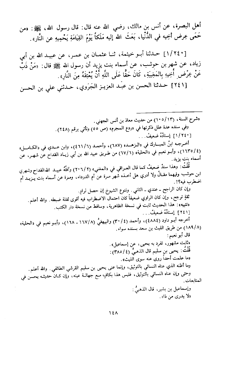 241 - حَدَّثَنَا الْحَسَنُ بْنُ عَبْدِ الْعَزِيزِ الْجَرَوِيُّ، حَدَّثَنِي عَلِيُّ بْنُ الْحَسَنِ الْعَسْقَلَانِيُّ، عَنْ عَبْدِ اللَّهِ بْنِ الْمُبَارَكِ، عَنْ لَيْثِ بْنِ سَعْدٍ، قَالَ: حَدَّثَنِي يَحْيَى بْنُ سُلَيْمِ بْنِ زَيْدٍ، مَوْلَى رَسُولِ اللَّهِ صَلَّى اللهُ عَلَيْهِ وَسَلَّمَ أَنَّهُ، سَمِعَ إِسْمَاعِيلَ بْنَ بَشِيرٍ مَوْلَى بَنِي مَغَالَةَ يَقُولُ: سَمِعْتُ جَابِرَ بْنَ عَبْدِ اللَّهِ، وَأَبَا طَلْحَةَ الْأَنْصَارِيَّيْنِ رَضِيَ اللَّهُ عَنْهُمَا يَقُولَانِ: قَالَ رَسُولُ اللَّهِ صَلَّى اللهُ عَلَيْهِ وَسَلَّمَ: «§مَا مِنِ امْرِئٍ يَخْذُلُ امْرَءًا مُسْلِمًا فِي مَوْطِنٍ تُنْتَهَكُ فِيهِ حُرْمَتُهُ، وَيُنْتَقَصُ فِيهِ مِنْ عِرْضِهِ، إِلَّا خَذَلَهُ اللَّهُ فِي مَوْطِنٍ يُحِبُّ فِيهِ نُصْرَتَهُ، وَمَا مِنَ امْرِئٍ يَنْصُرُ امْرَءًا مُسْلِمًا فِي مَوْطِنٍ يُنْتَقَصُ فِيهِ مِنْ عِرْضِهِ وَتُنْتَهَكُ فِيهِ مِنْ حُرْمَتِهِ، إِلَّا نَصَرَهُ اللَّهُ فِي مَوْطِنٍ يُحِبُّ فِيهِ نُصْرَتَهُ» قَالَ: وَحَدَّثَنِيهِ عُبَيْدُ اللَّهِ بْنُ عَبْدِ اللَّهِ بْنِ عُمَرَ بْنِ عُتْبَةَ بْنِ شَدَّادٍ