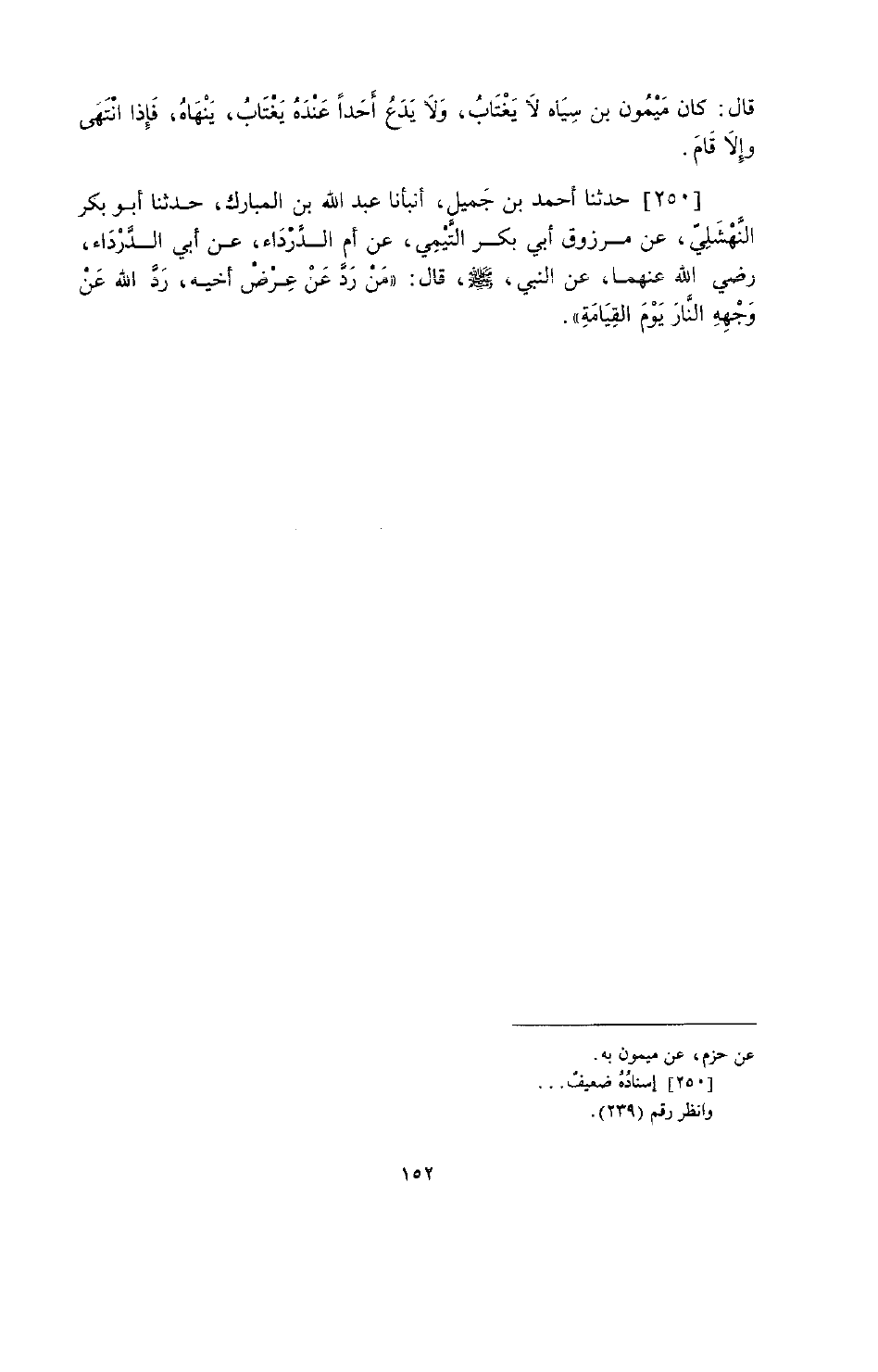 250 - حَدَّثَنَا أَحْمَدُ بْنُ جَمِيلٍ، أَخْبَرَنَا عَبْدُ اللَّهِ بْنُ الْمُبَارَكِ، حَدَّثَنَا أَبُو بَكْرٍ النَّهْشَلِيُّ، عَنْ مَرْزُوقٍ أَبِي بَكْرٍ التَّيْمِيِّ، عَنْ أُمِّ الدَّرْدَاءِ، عَنْ أَبِي الدَّرْدَاءِ رَضِيَ اللَّهُ عَنْهُمَا، عَنِ النَّبِيِّ صَلَّى اللهُ عَلَيْهِ وَسَلَّمَ قَالَ: «§مَنْ رَدَّ عَنْ عِرْضِ أَخِيهِ، رَدَّ اللَّهُ عَنْ وَجْهِهِ النَّارَ يَوْمَ الْقِيَامَةِ»